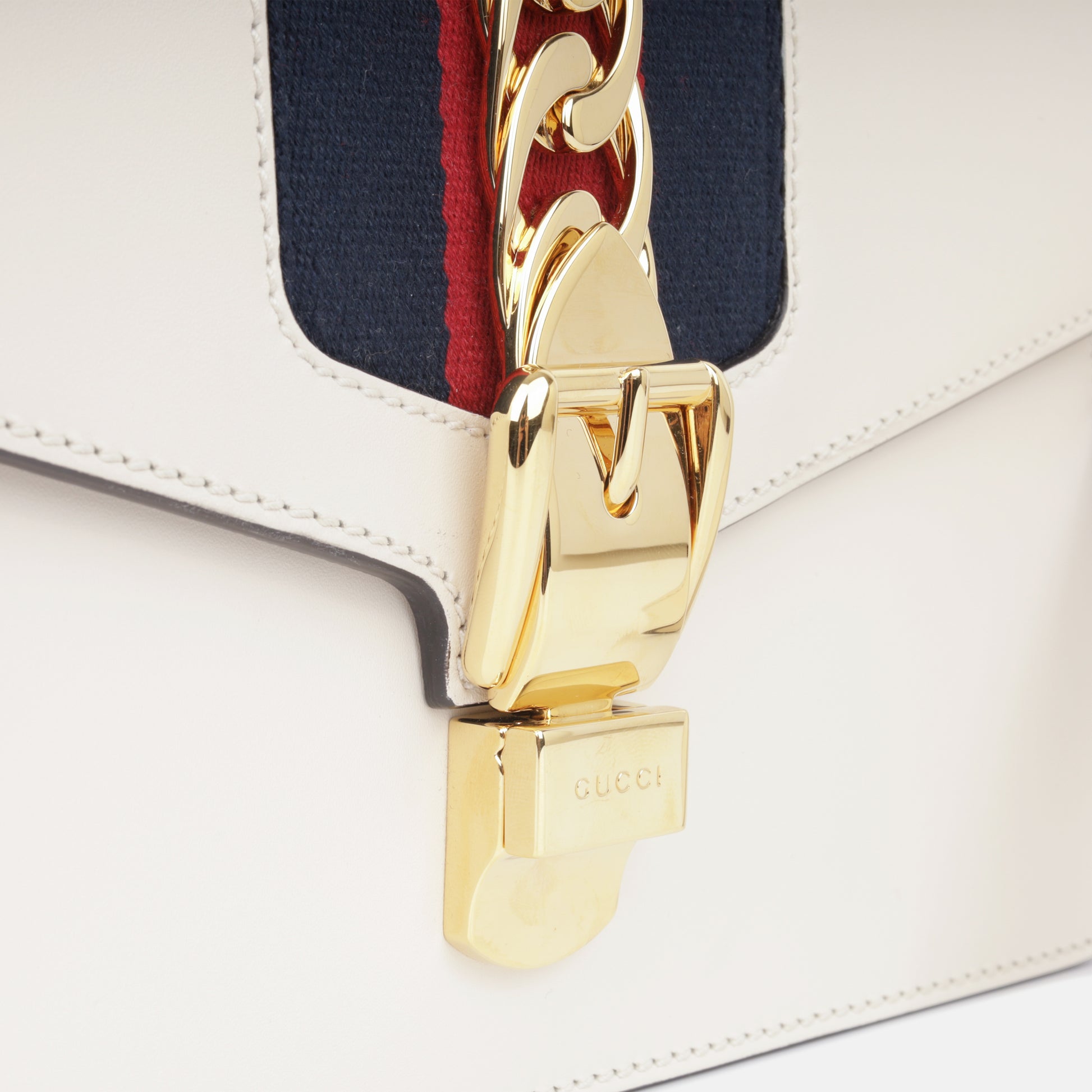 The Gucci Sylvie became an instant classic the moment it landed in stores. The bag is complimented by the brand's signature red and blue striped ribbon handle and also features a removable leather shoulder strap. This stunning bag is an absolutely necessary addition to any luxury handbag collection. With a gold buckle chain prominently depicted on the front flap, the Sylvie is luxurious, glamorous and the perfect compliment to anything you may have in your wardrobe.