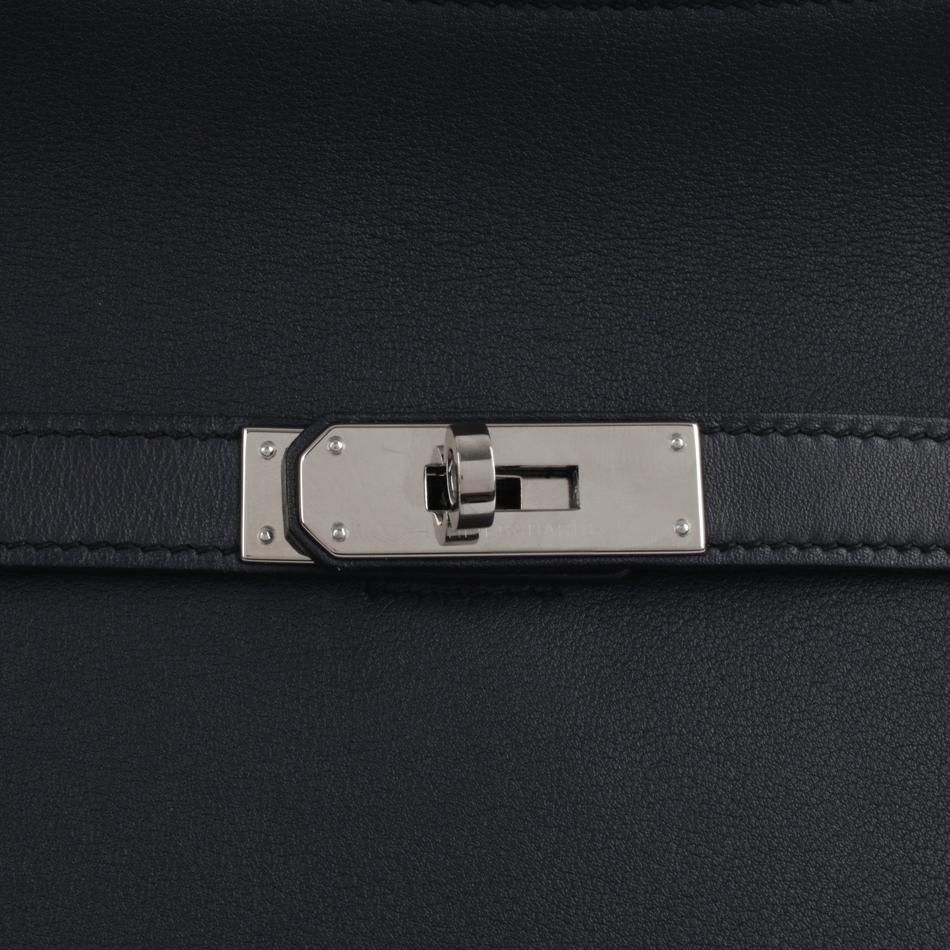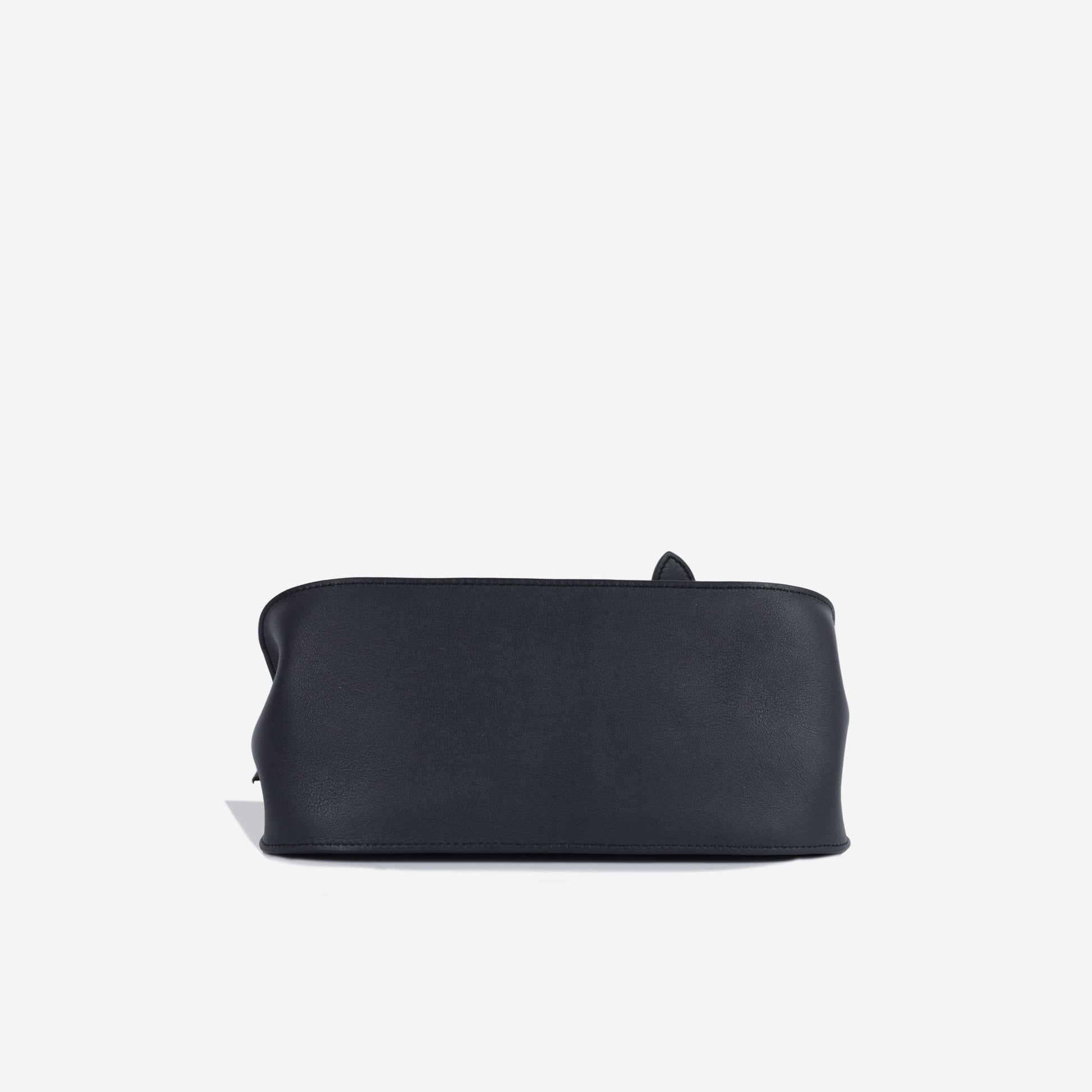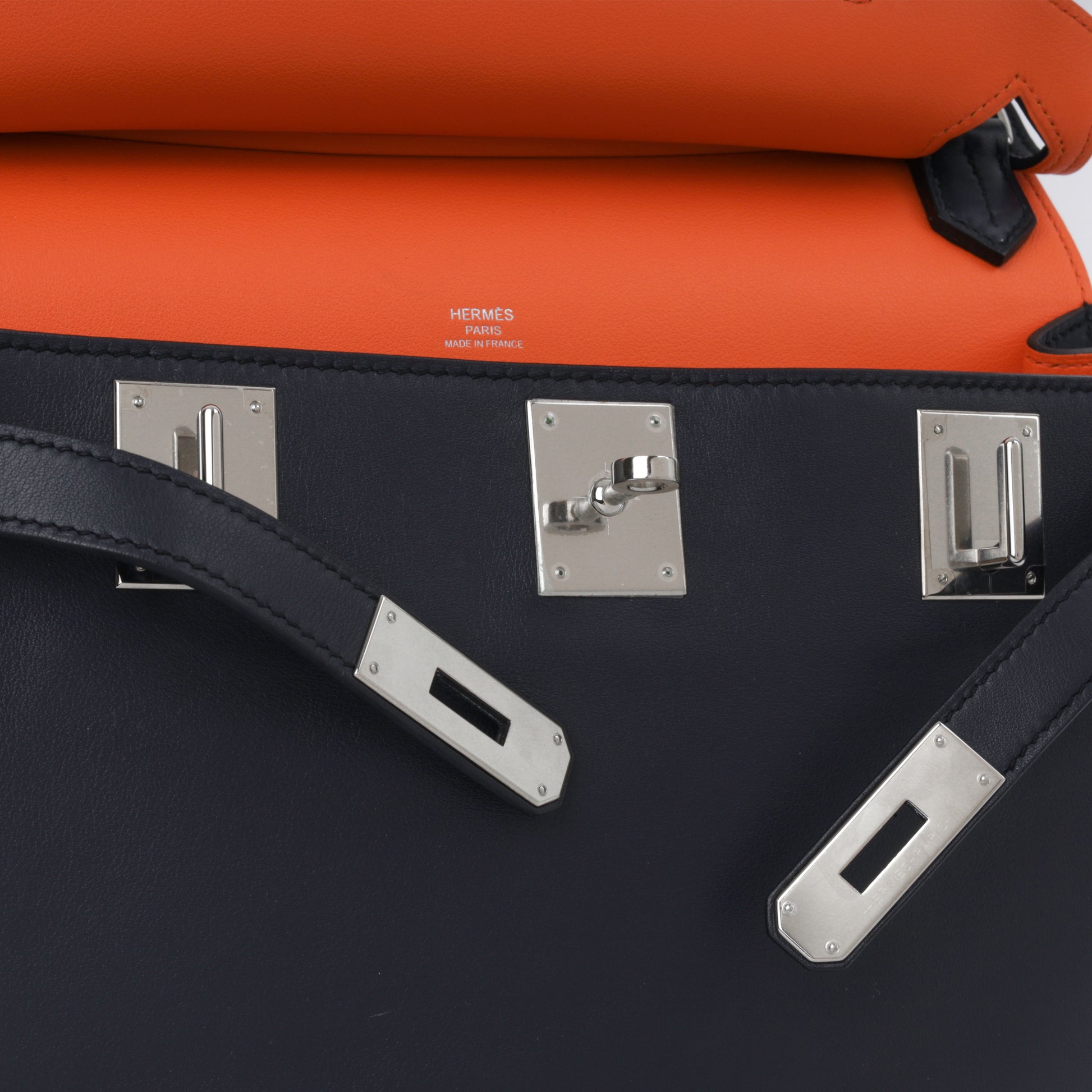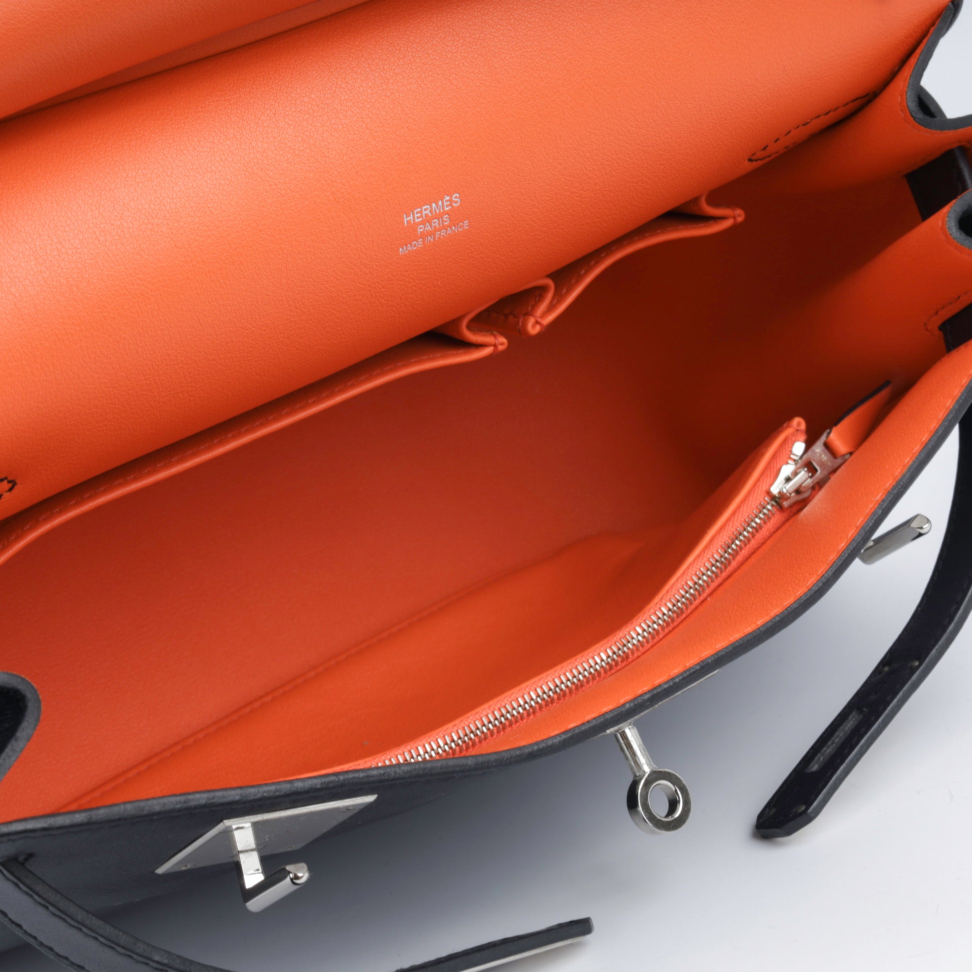 Style meets contemporary efficiency in the form of the Hermès Jypsière. Carefully crafted from Bleu Nuit Swift leather, this iconic piece also features palladium hardware, elongated front flap and twist lock closure. Its interior is crafted in the same leather in Orange Poppy, with an array of spacious storage compartments. The perfect every day back for a woman with a love for understated luxury, the Jypsière is a timeless classic that will remain in your wardrobe forever.