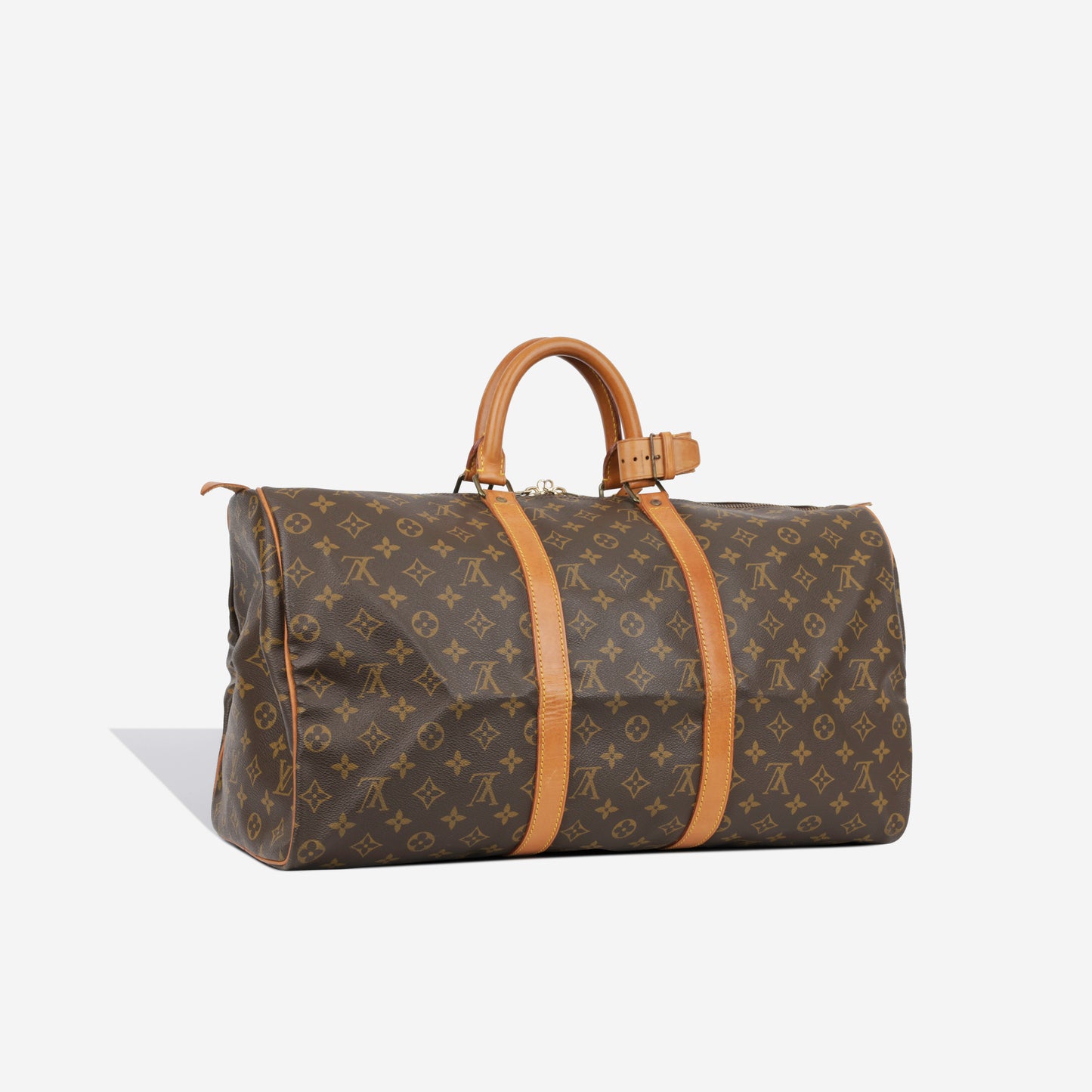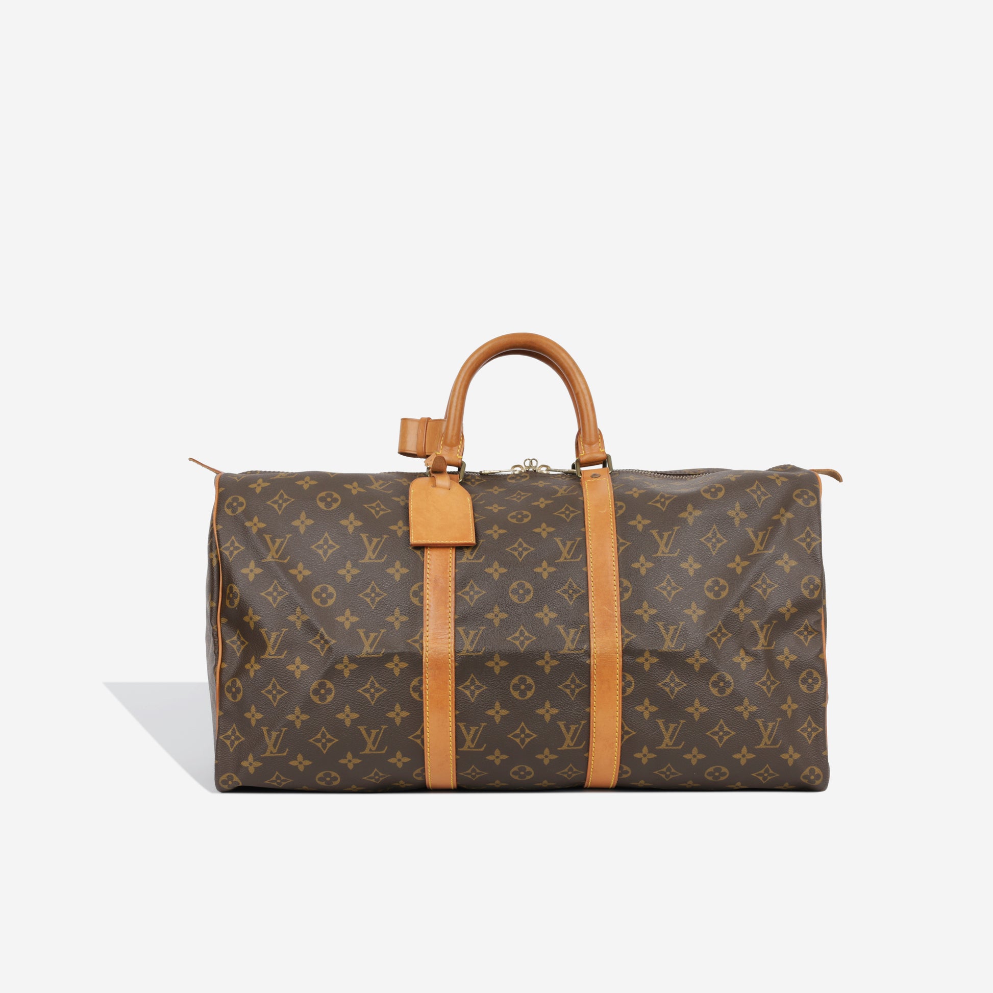 Louis Vuitton presents their signature Keepall bag, the perfect travel accessory for both men and women. Carefully crafted in the brand's iconic Monogram canvas with beige leather trimming, piping, top handles, the Keepall is sleek and sophisticated. Large and spacious, making it easy to carry your whole world with you wherever you go, the Keepall is also extremely lightweight. It's the perfect travel companion and a necessary addition to any luxury bag collection, especially luggage.