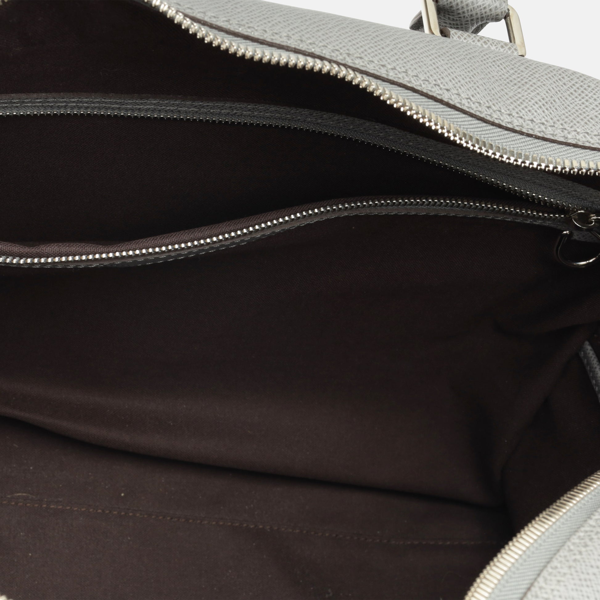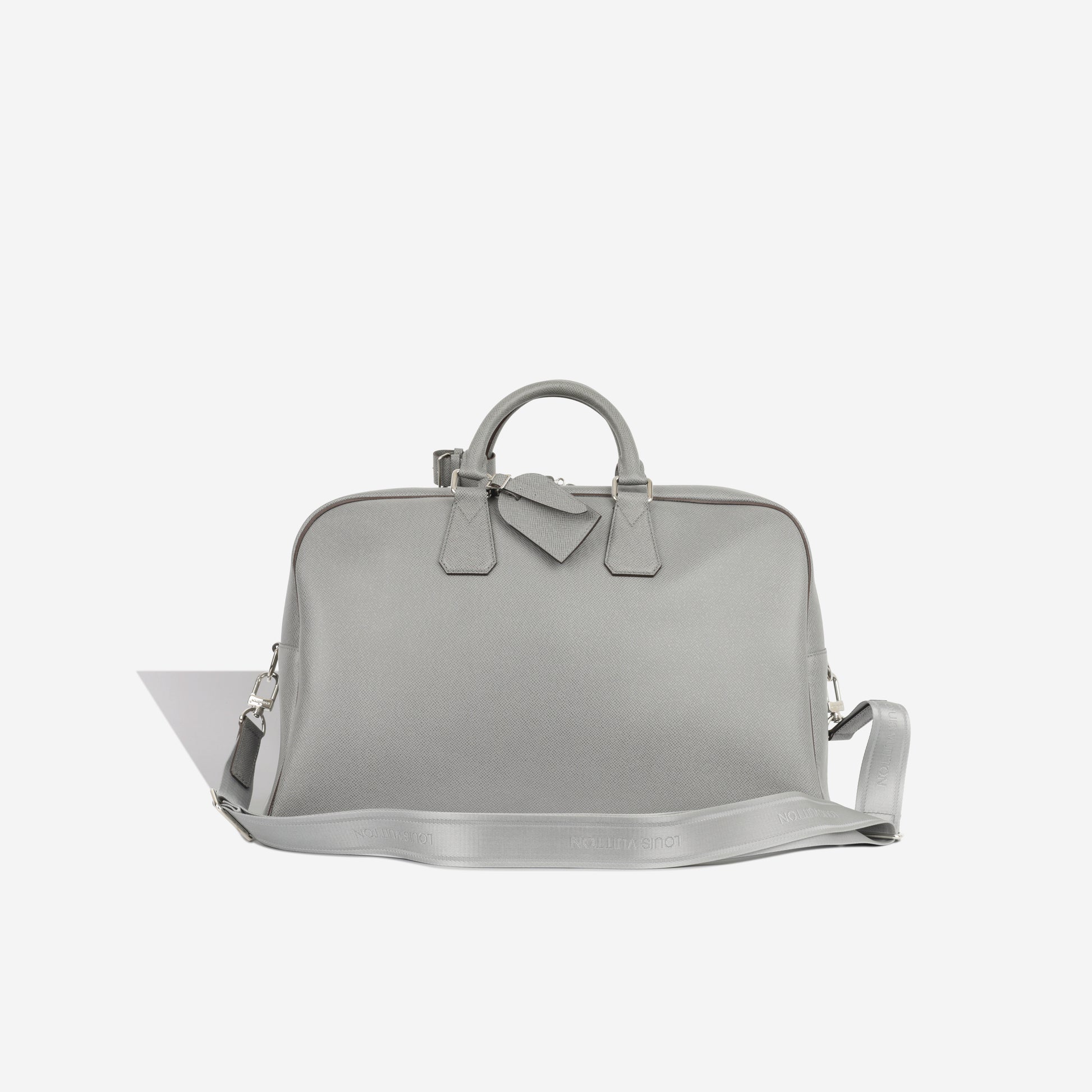 - Removable grey fabric strap embossed with “Louis Vuitton”