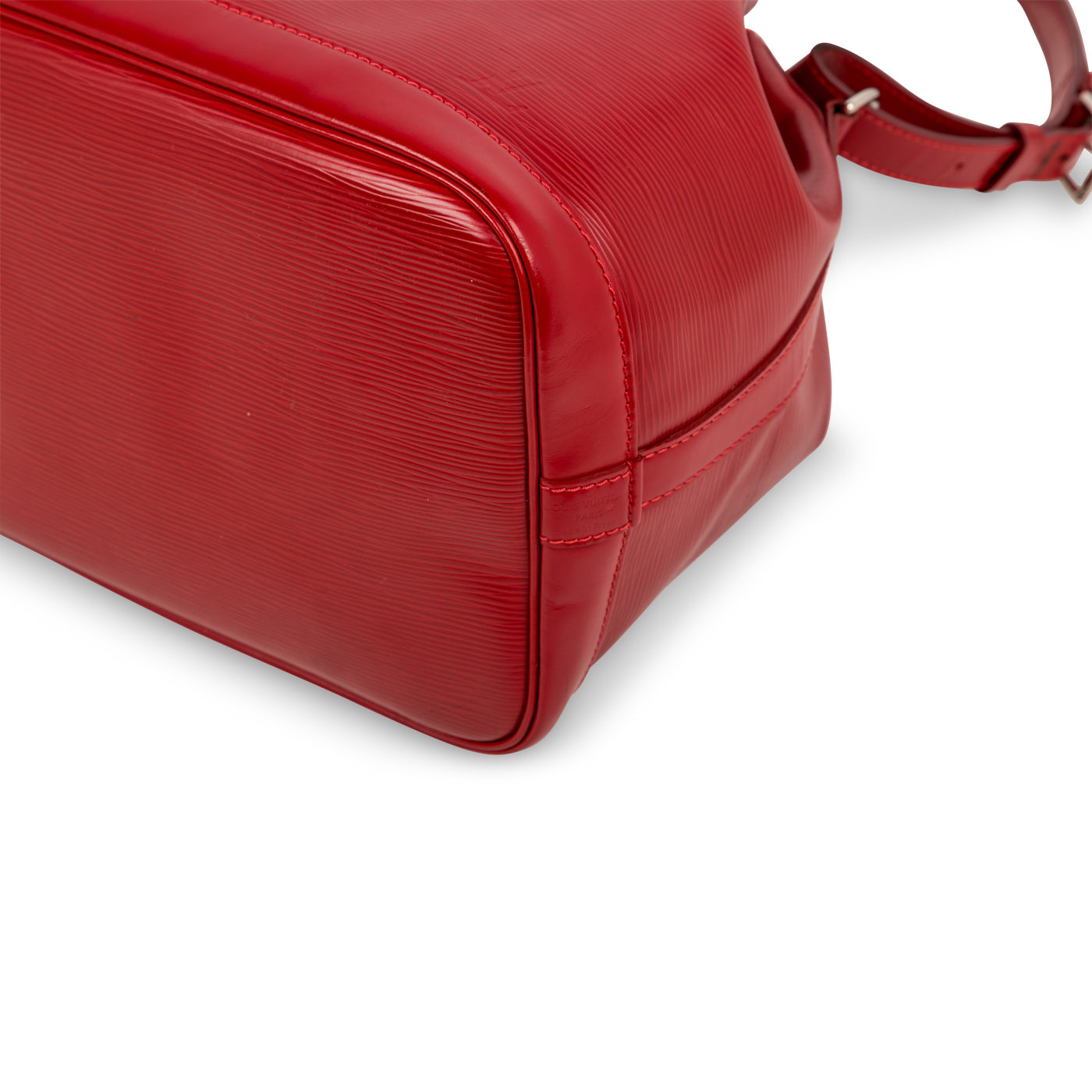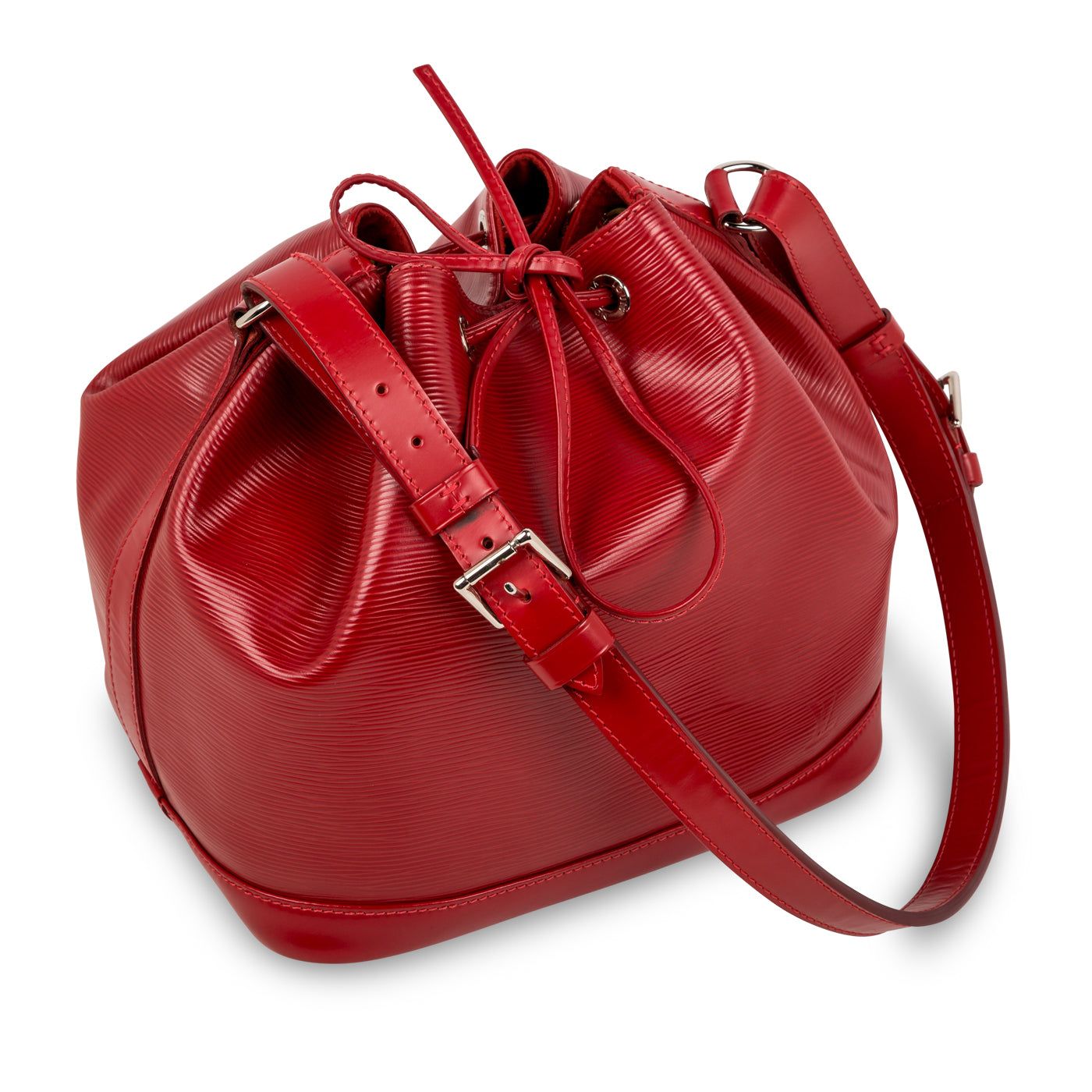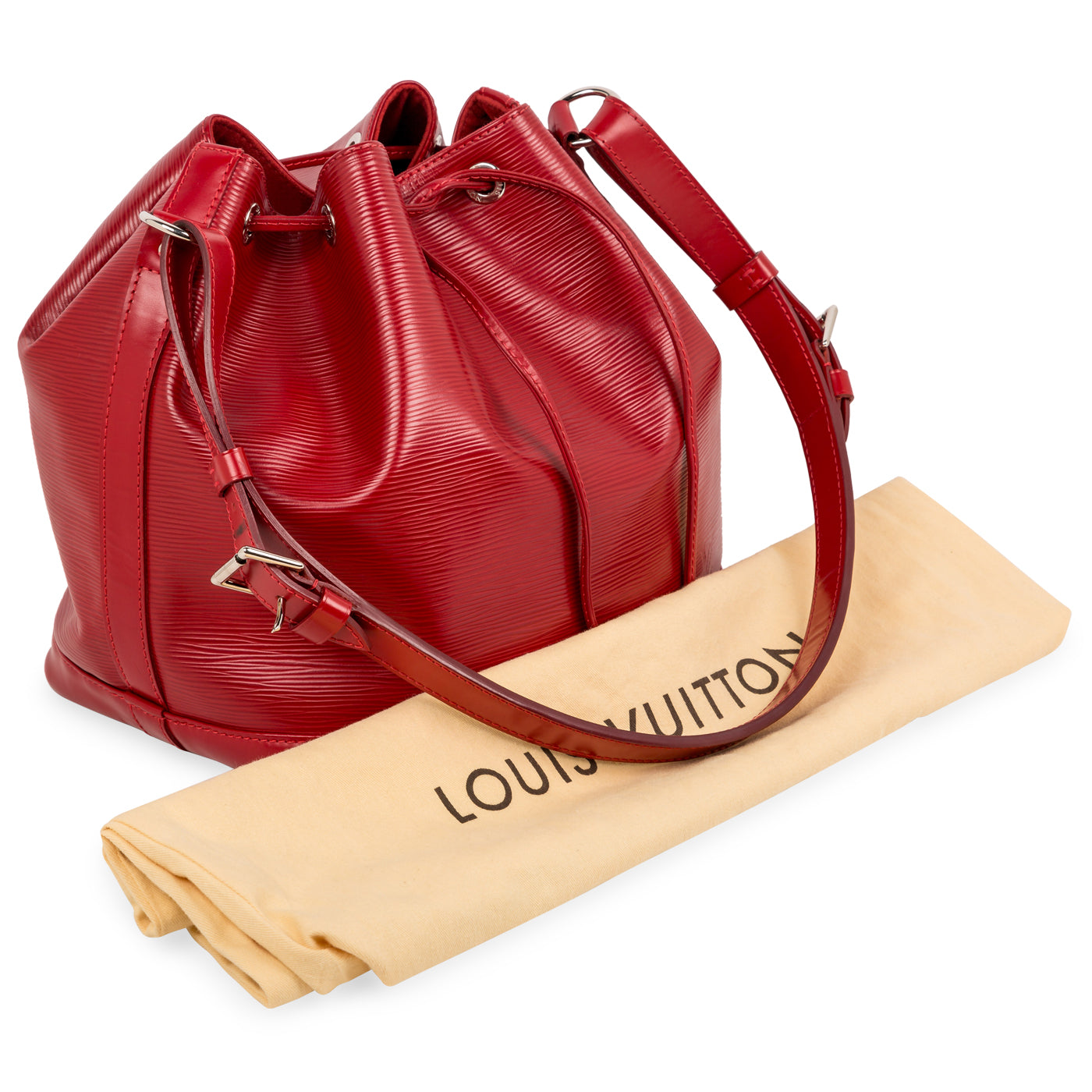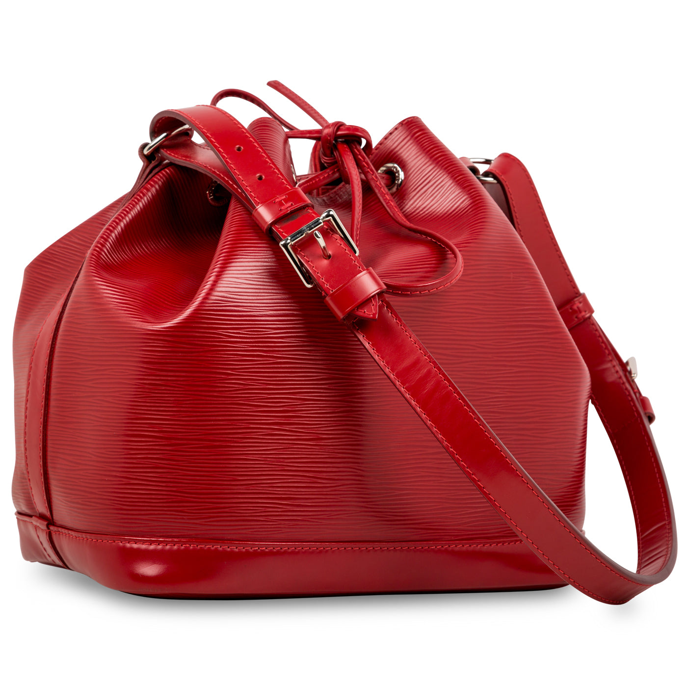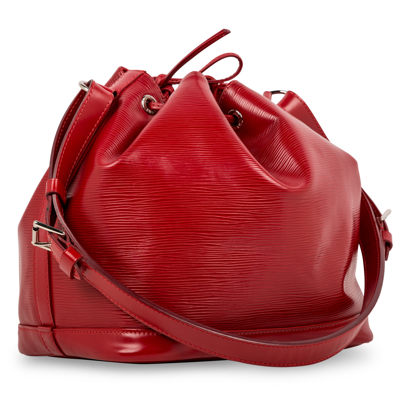 The Noe bucket bag is crafted from Louis Vuitton's signature Epi leather and silver hardware, and features an open top with a drawstring for easy access. The inside features a large compartment lined in faux suede for a luxurious feel.
