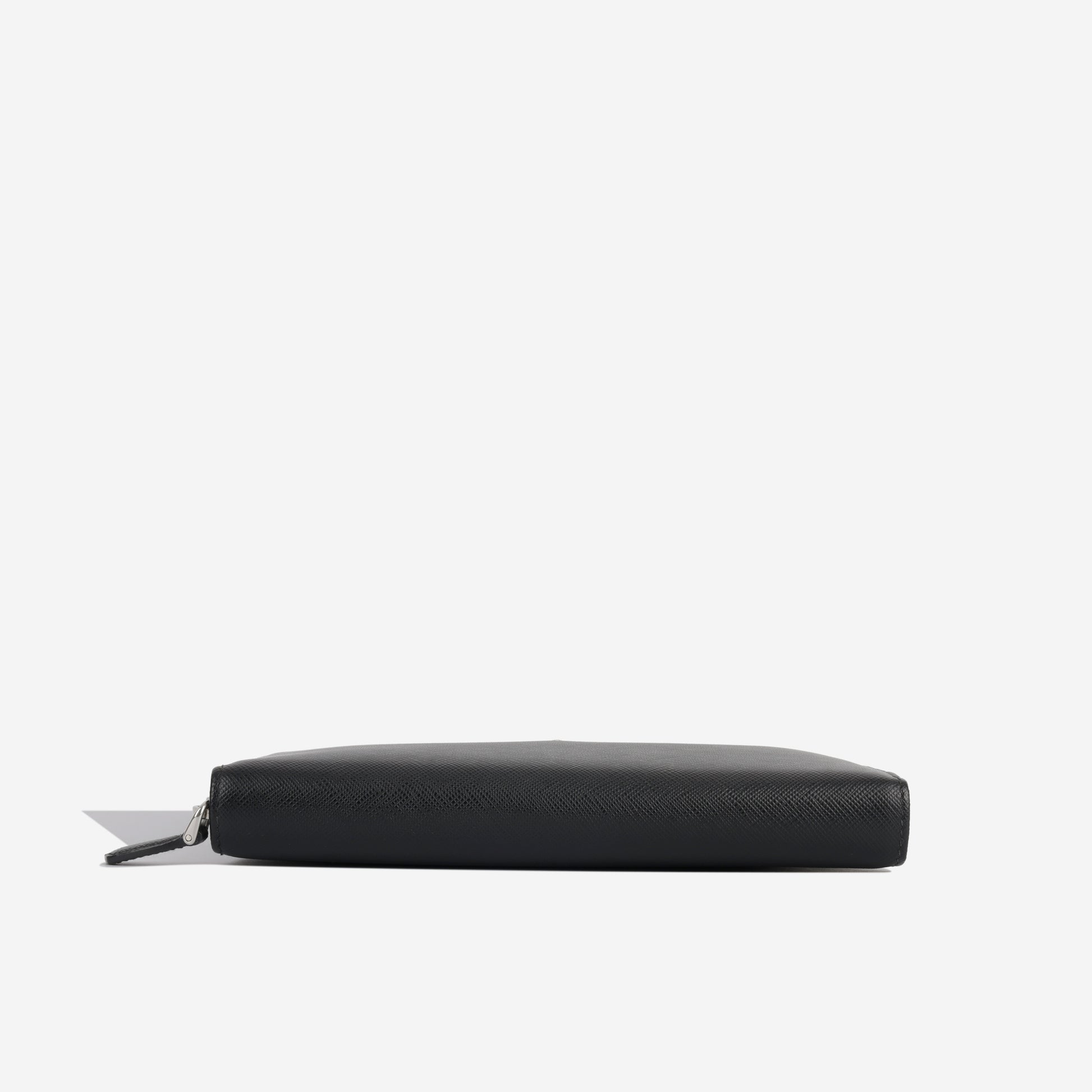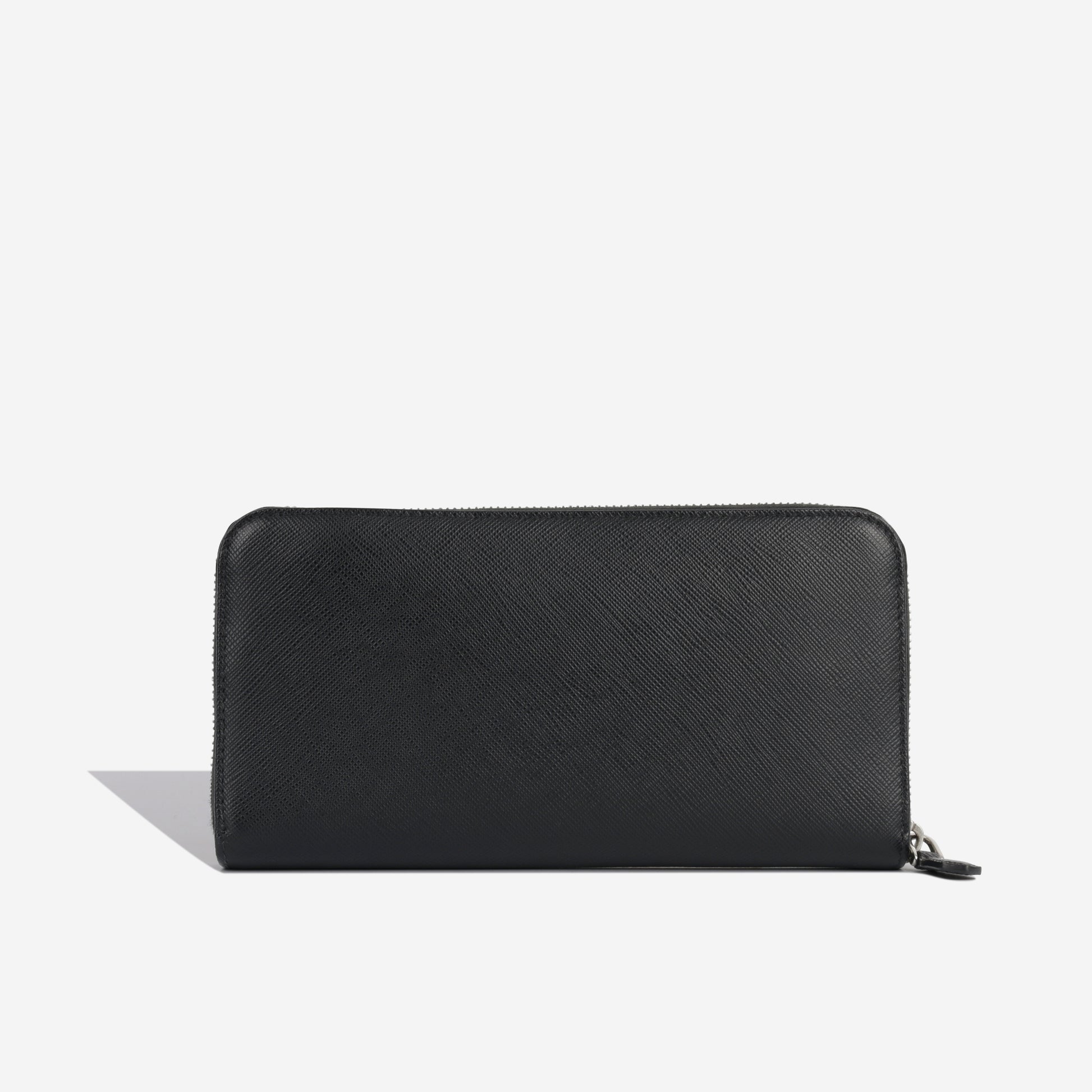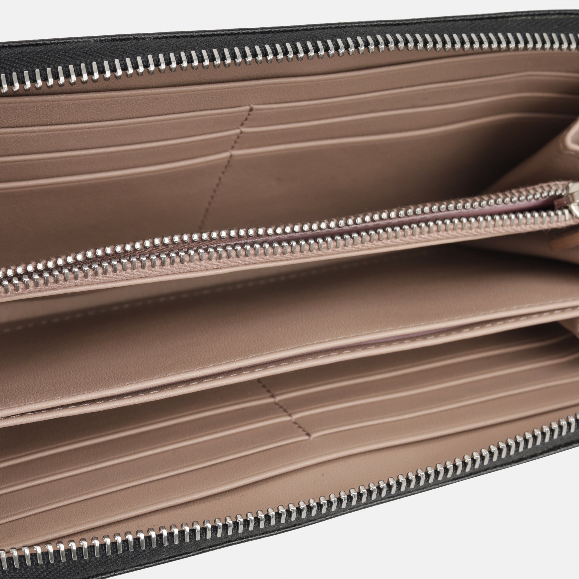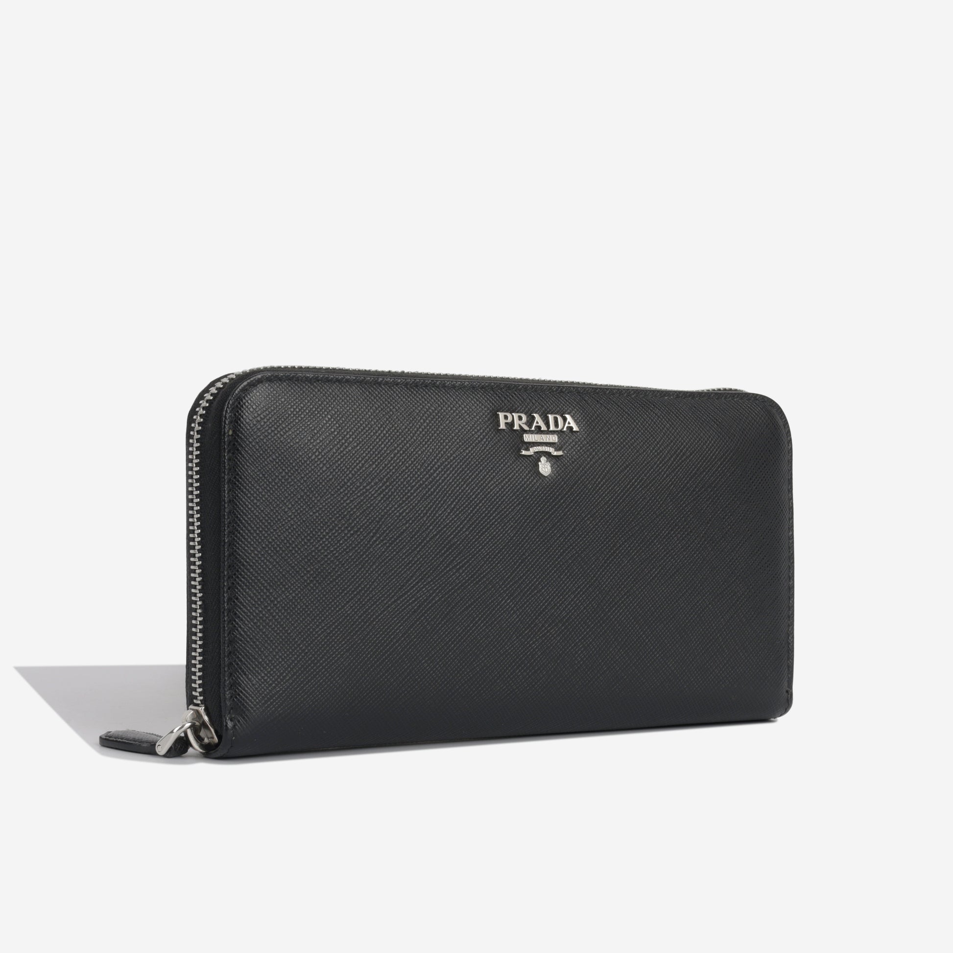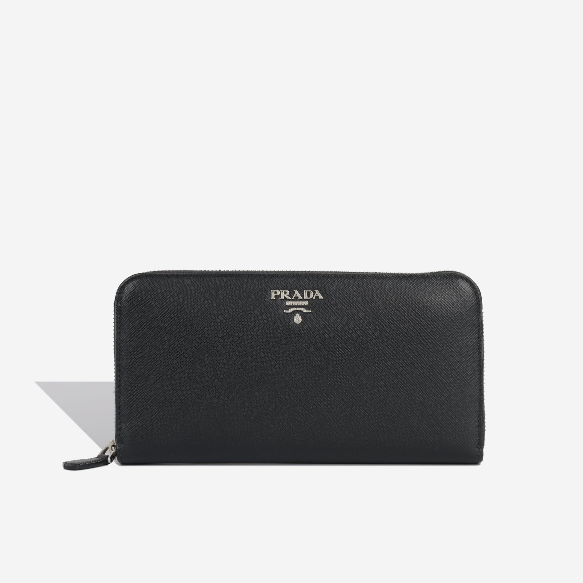 This Prada wallet comes in a classic combination of black Saffiano leather and complimented with silver hardware. It is the perfect purse to carry around with you throughout the day as an elevated casual piece. Spacious enough to use as your main wallet, it features a long yet slim design with several storage compartments.