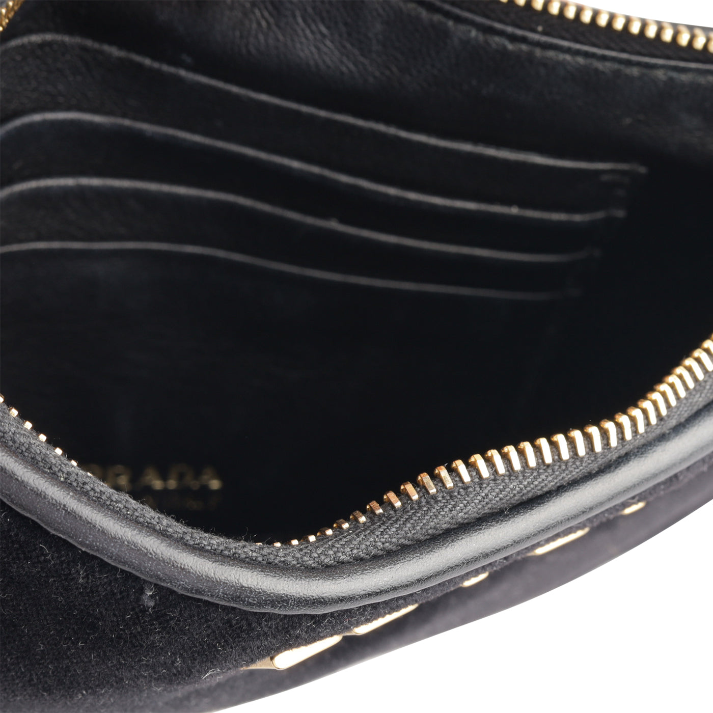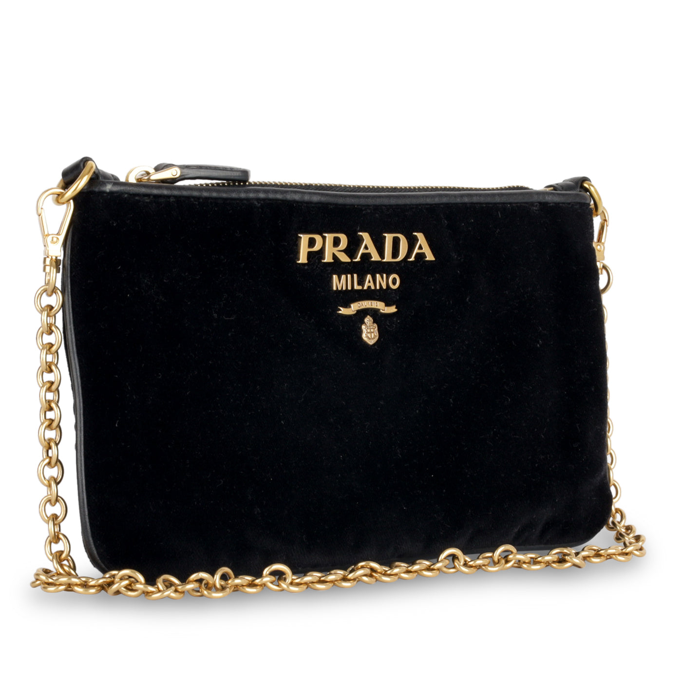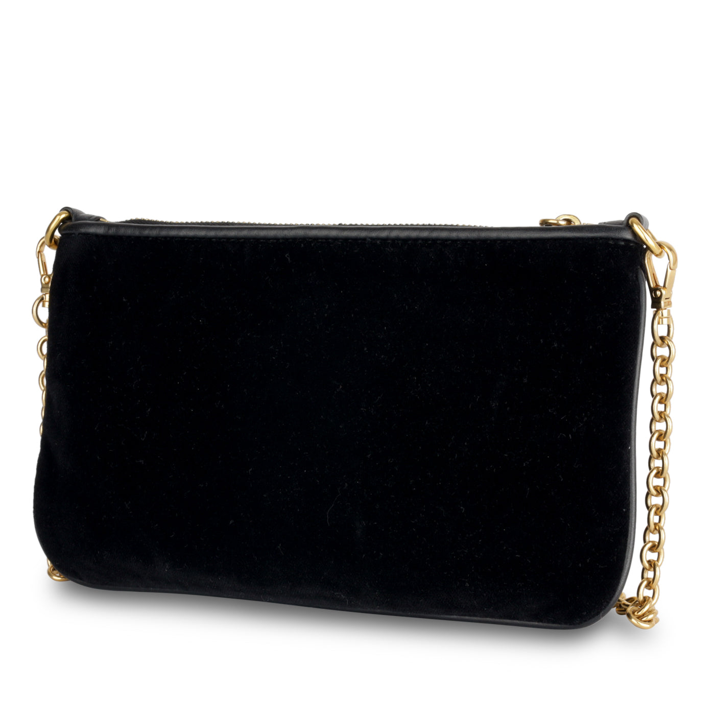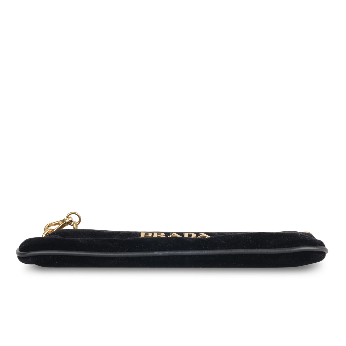 Crafted from soft, black velvet, Prada presents this stunning pouch with gold tone hardware and a chain strap. The perfect accessory for any woman who doesn't have a lot to carry, it featuring four card slots and a tiny compartment ideal for carrying loose change and some bills. Wear this as a mini shoulder bag with the chain, or remove it for a clutch or pouch to use inside your bigger bag.