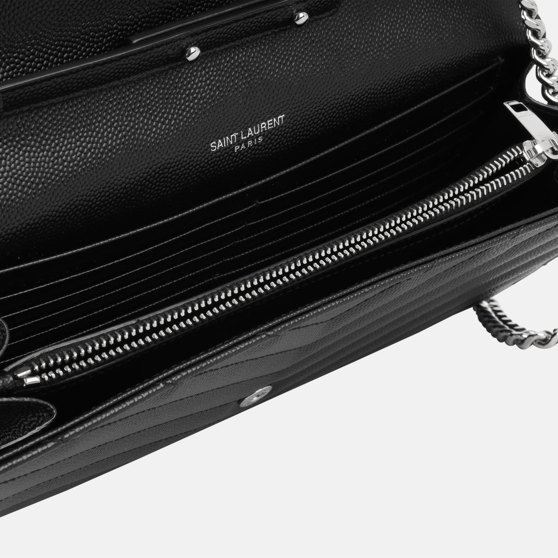 A classic piece from Saint Laurent, the Cassandre wallet-on-chain is the ideal accessory to compliment any look from day to night. Carefully crafted from grained, black calfskin leather with a matelassé design, featuring a delicate silver chain and prominent YSL logo - this bag is suitable for any occasion.
