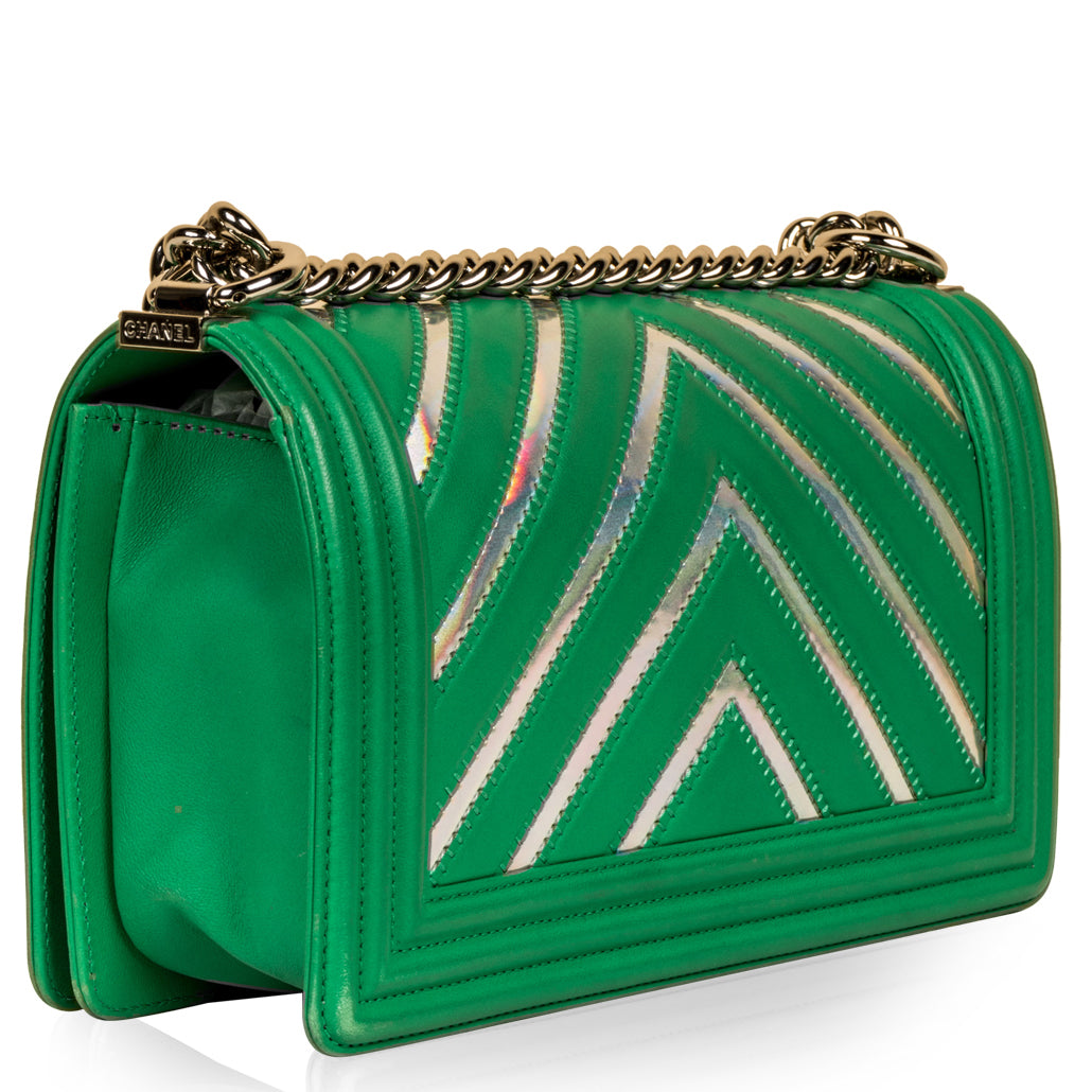 A true must-have for any major Chanel collector! Presented in their Spring/Summer 2017 collection, Chanel's PVC Rainbow Chevron Boy bag wowed fashion lovers globally. Crafted in smooth, neon green lambskin leather with rainbow PVC chevron detailing, this Boy bag is both extremely unique and rare. The perfect compliment to any neutral-toned outfit, this piece is perfect for any woman who wants to make a statement.
