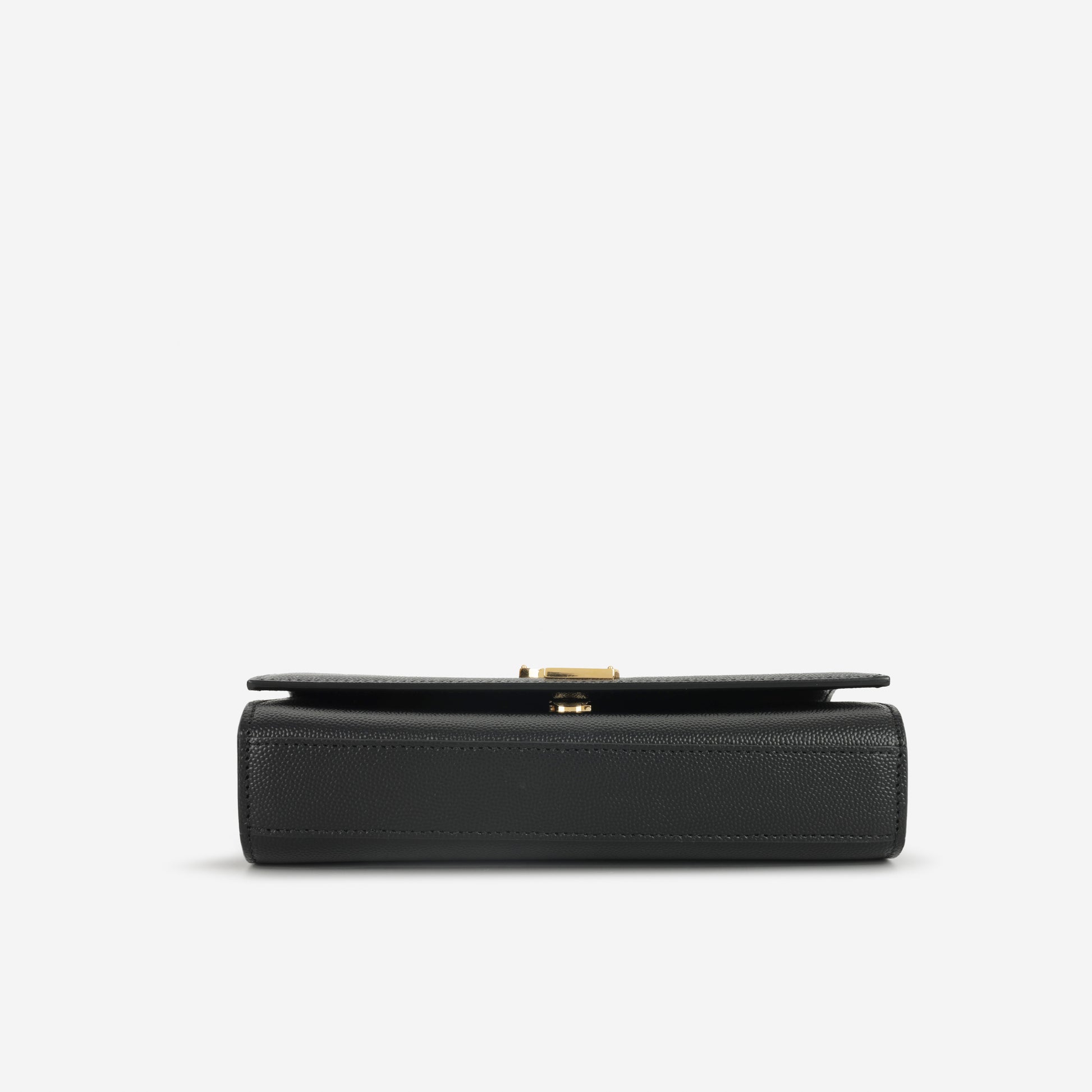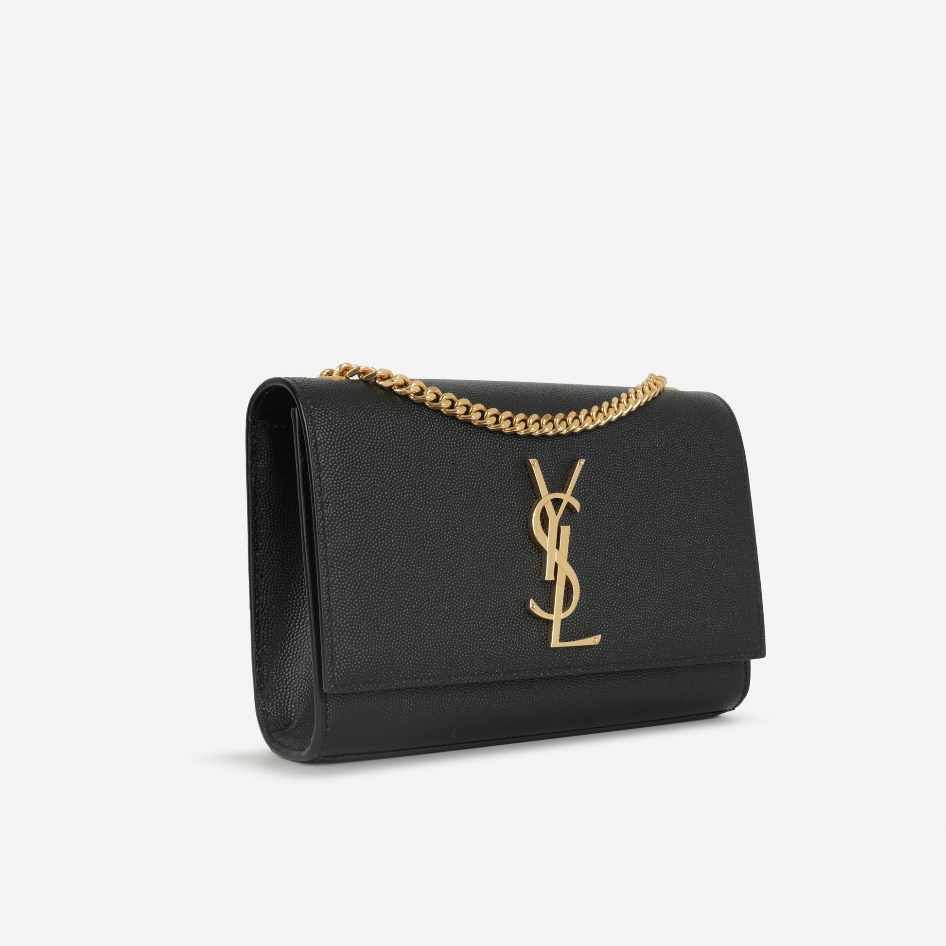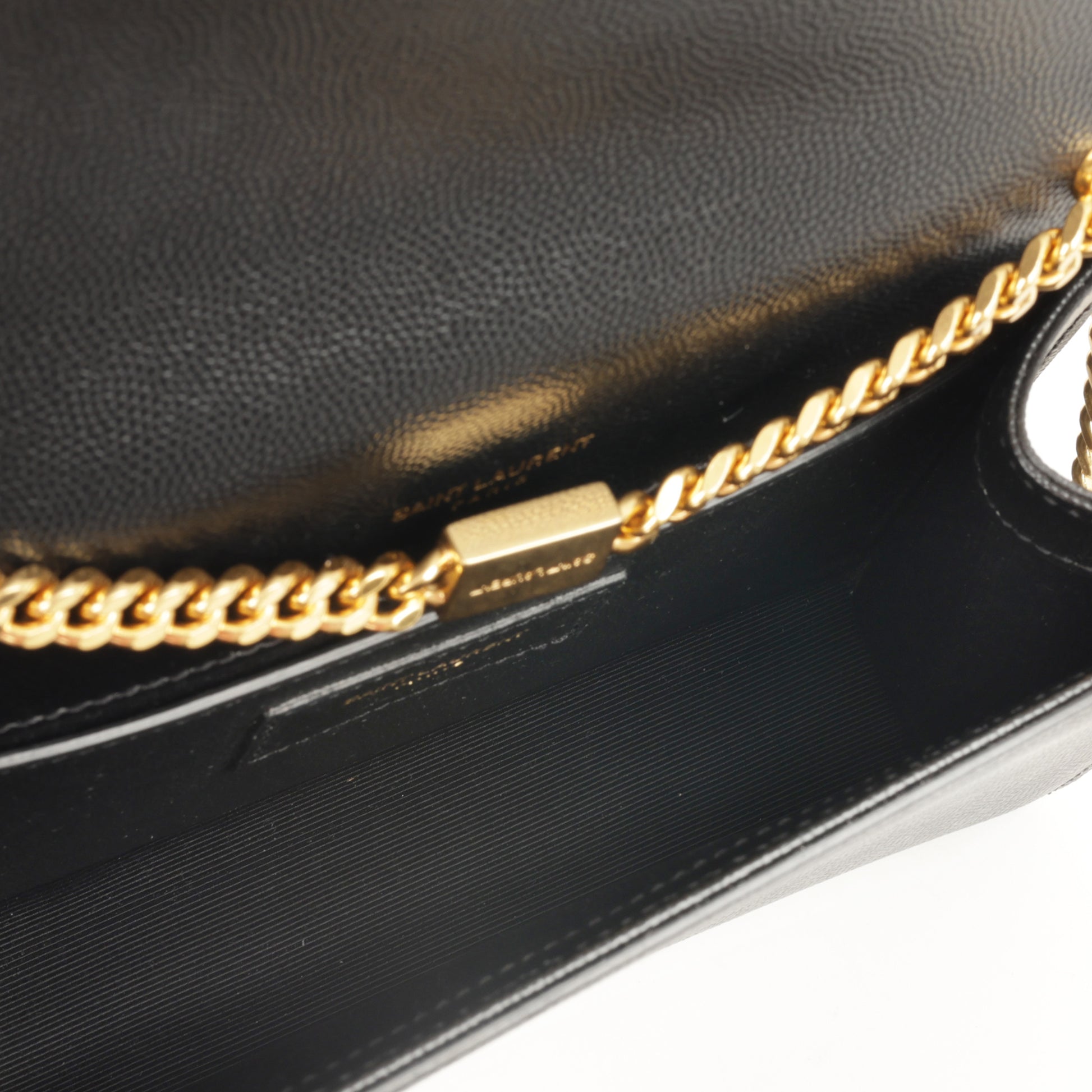 The Saint Laurent Small Kate in black grained leather with gold hardware is a timeless evening bag known for its sleek silhouette and understated elegance. This pre-loved example is in excellent condition, offering a versatile option for day-to-night wear.