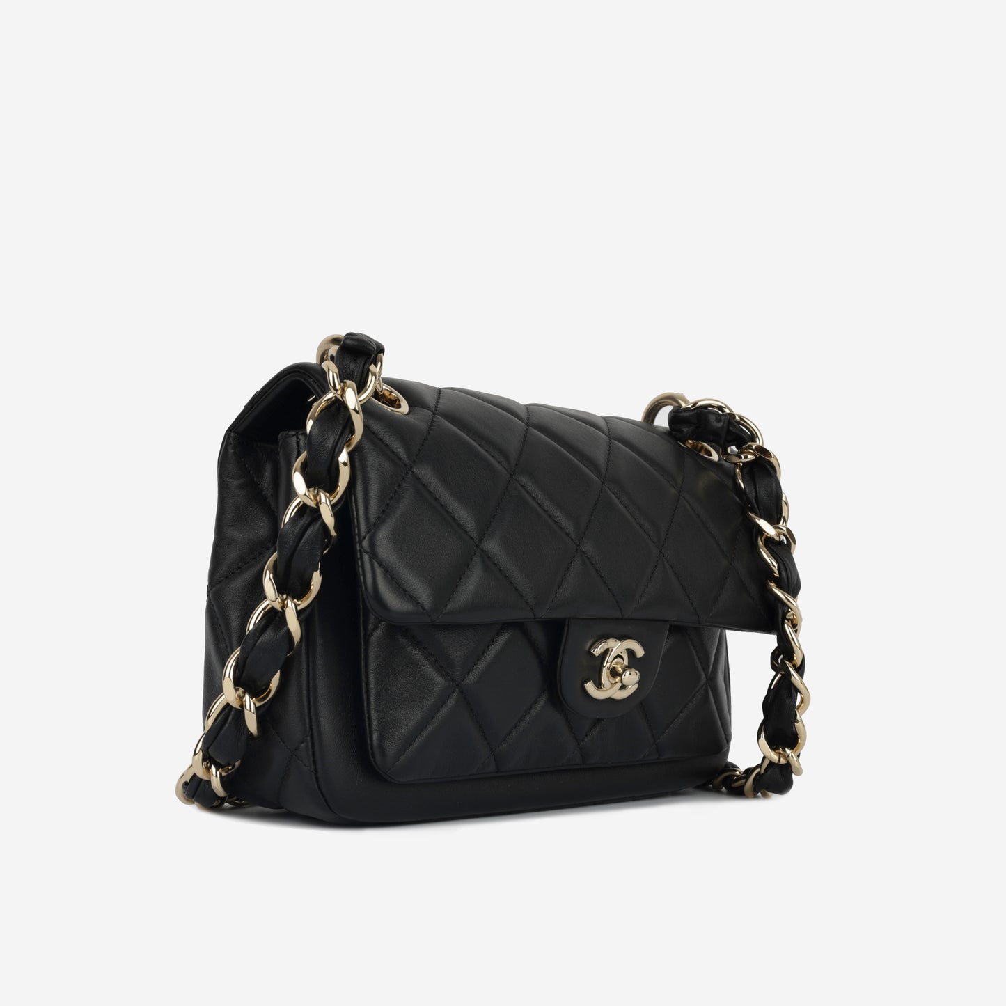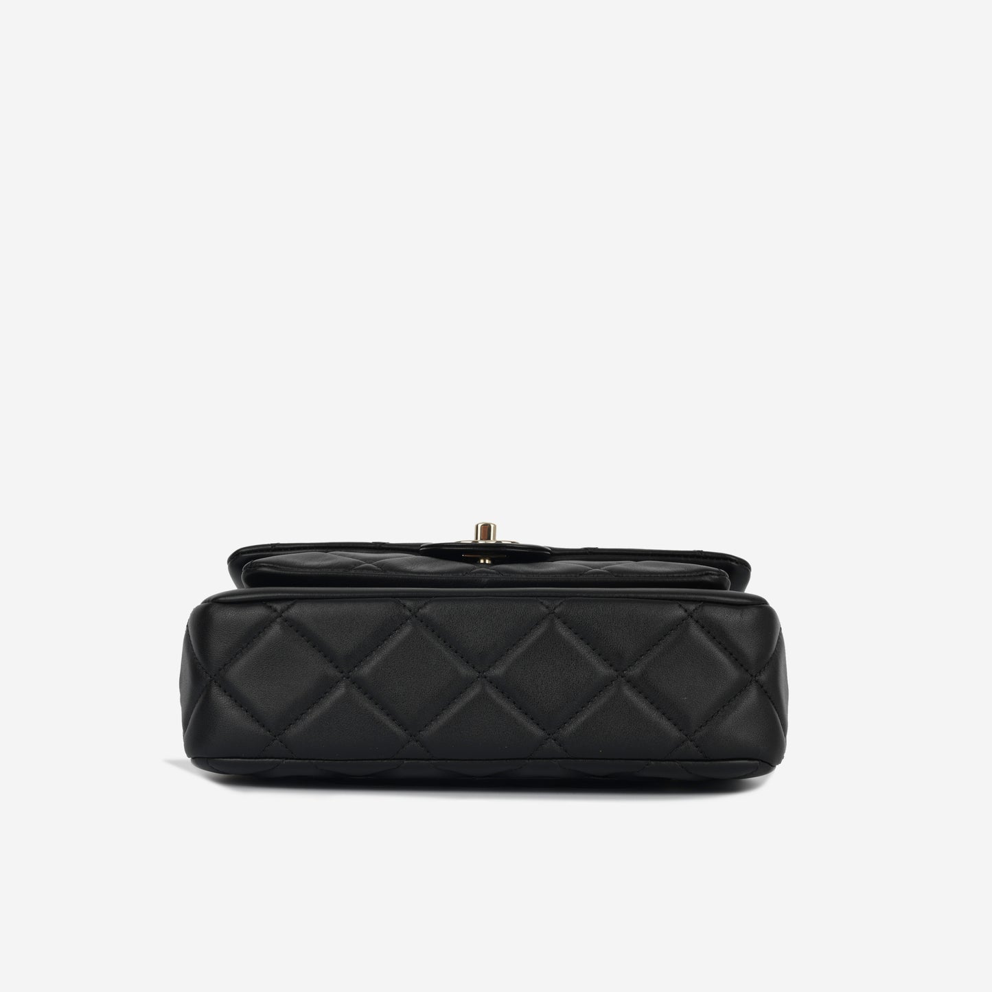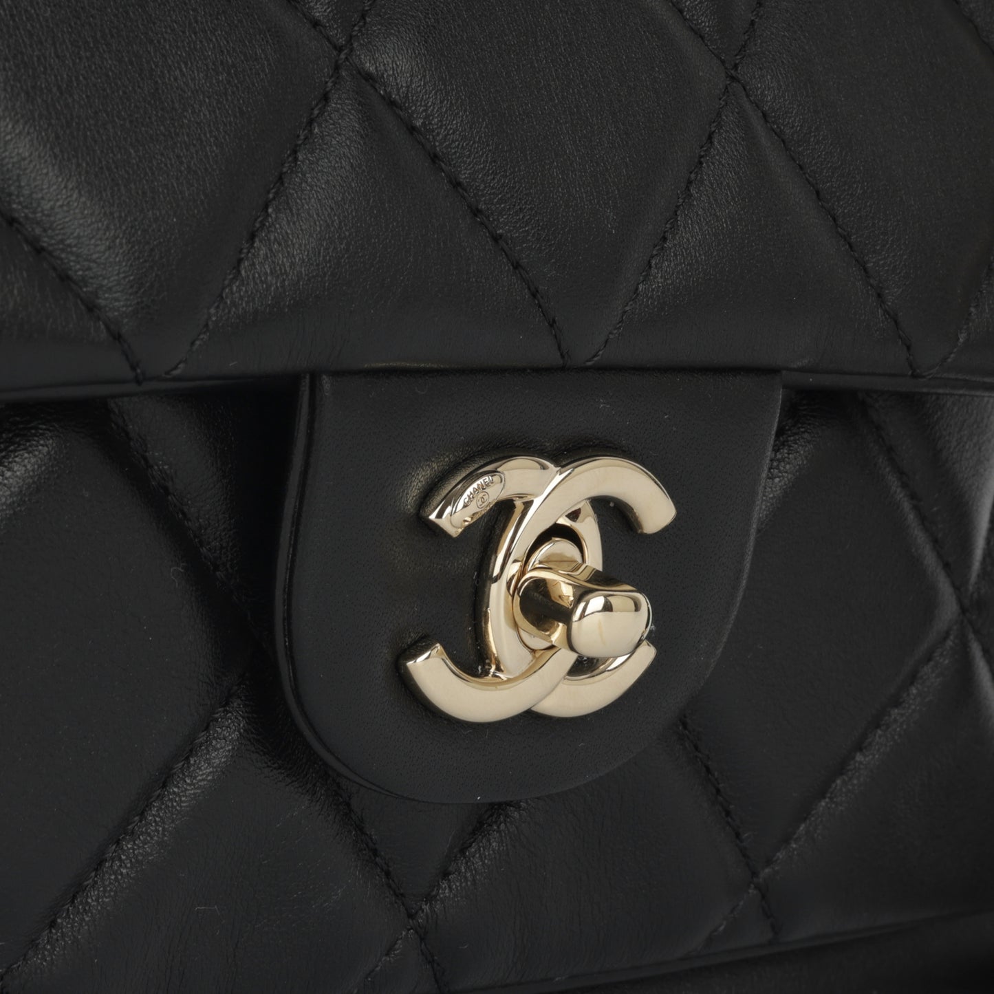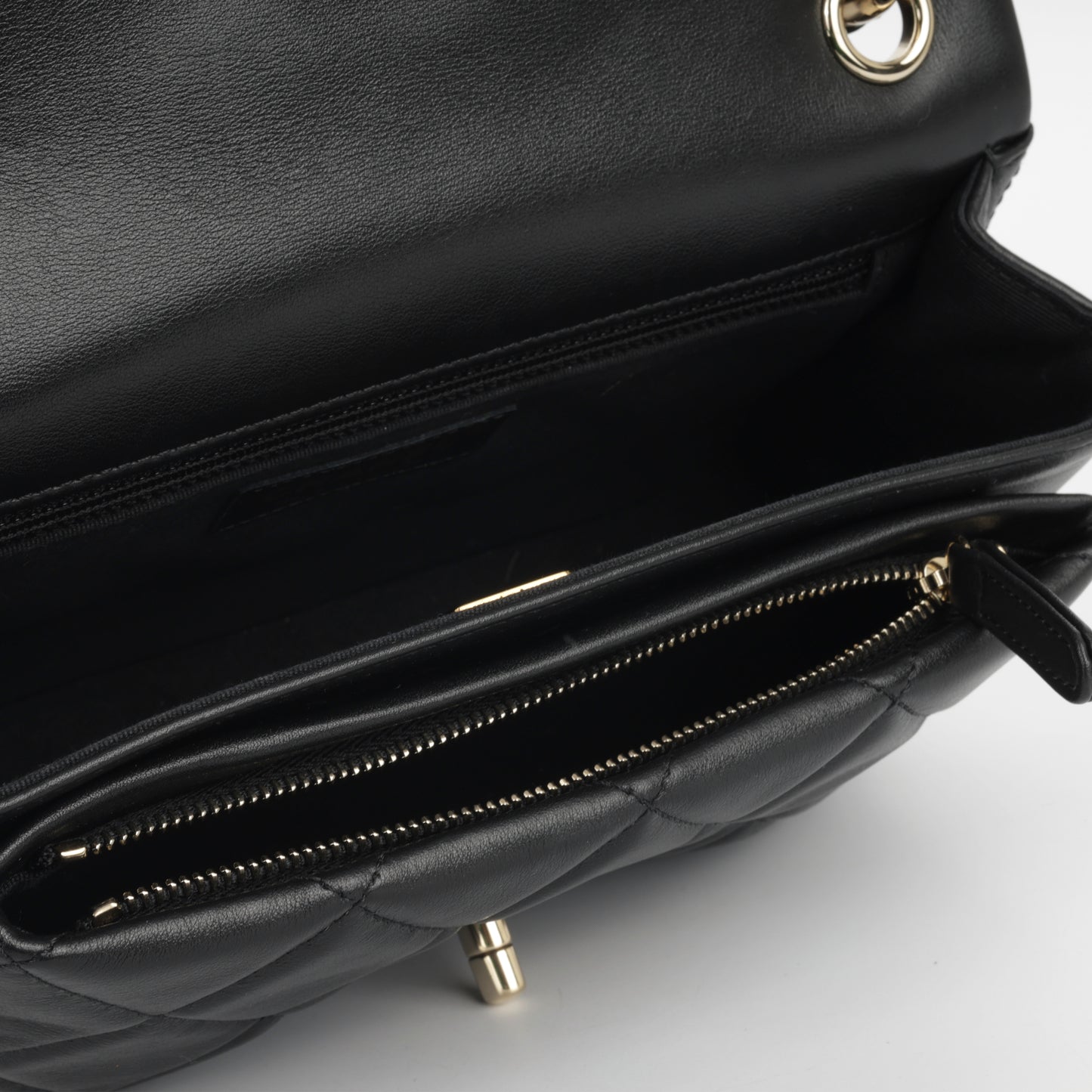 Introducing the Seasonal 2021 Pocket Flap in Black Lambskin with Champagne Gold-Tone Hardware . This exquisite piece combines timeless elegance with contemporary style, making it a must-have for fashion enthusiasts.Crafted from luxurious black quilted lambskin leather, this pocket flap is adorned with sophisticated champagne gold-tone hardware. The CC twist-lock closure adds a touch of iconic charm, securing your essentials with a stylish twist.