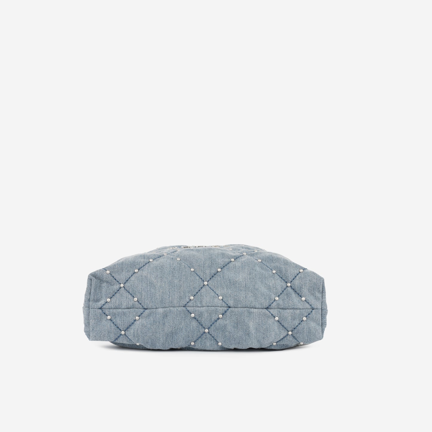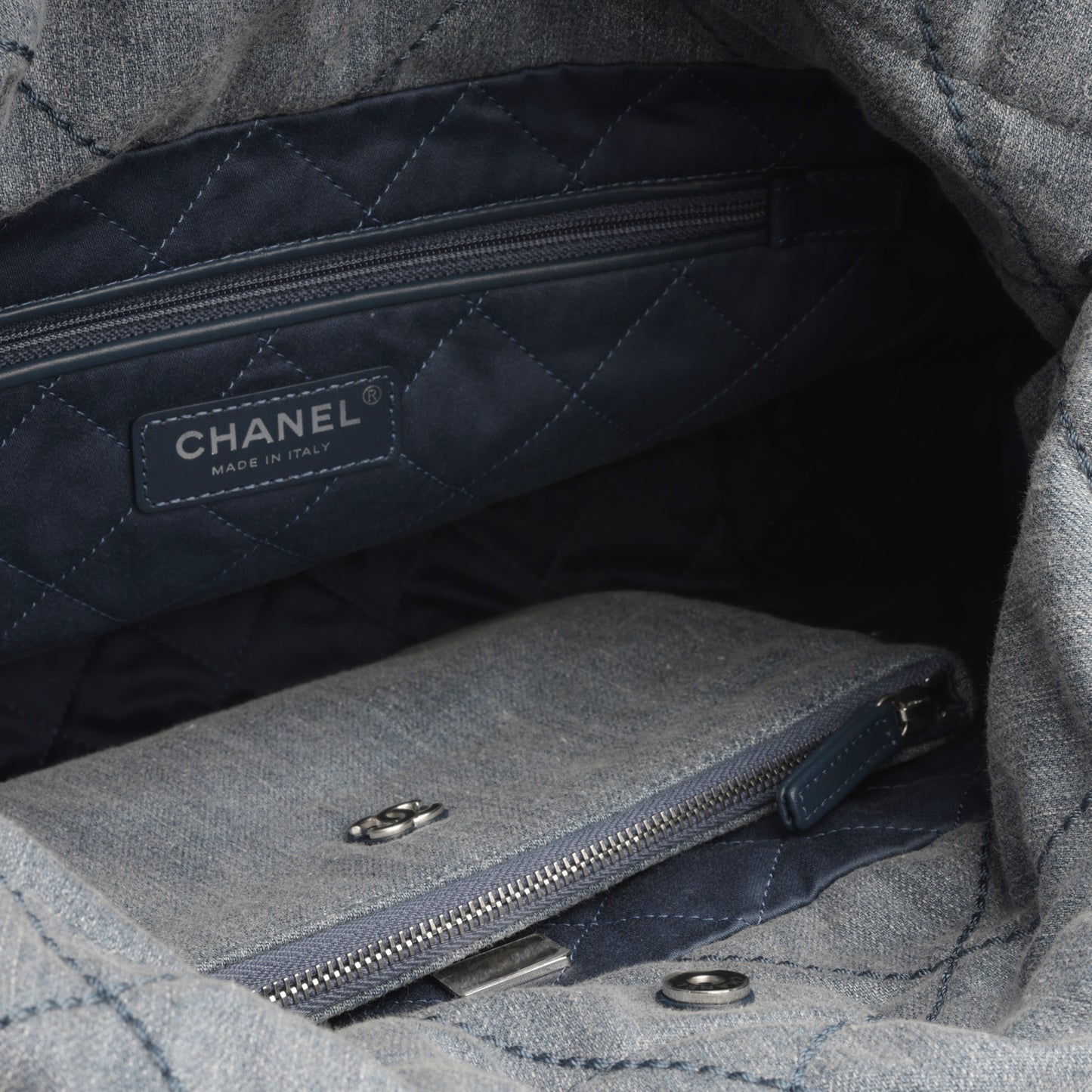 Carefully crafted from quilted denim, Chanel presents their 22 Tote bag. The chicest item for the lady that wants to carry everything around with them, this bag features Chanels classic interwoven back straps along with top handles to carry it handheld. This piece from 2022 is a well worthy addition to any luxury handbag collection.
