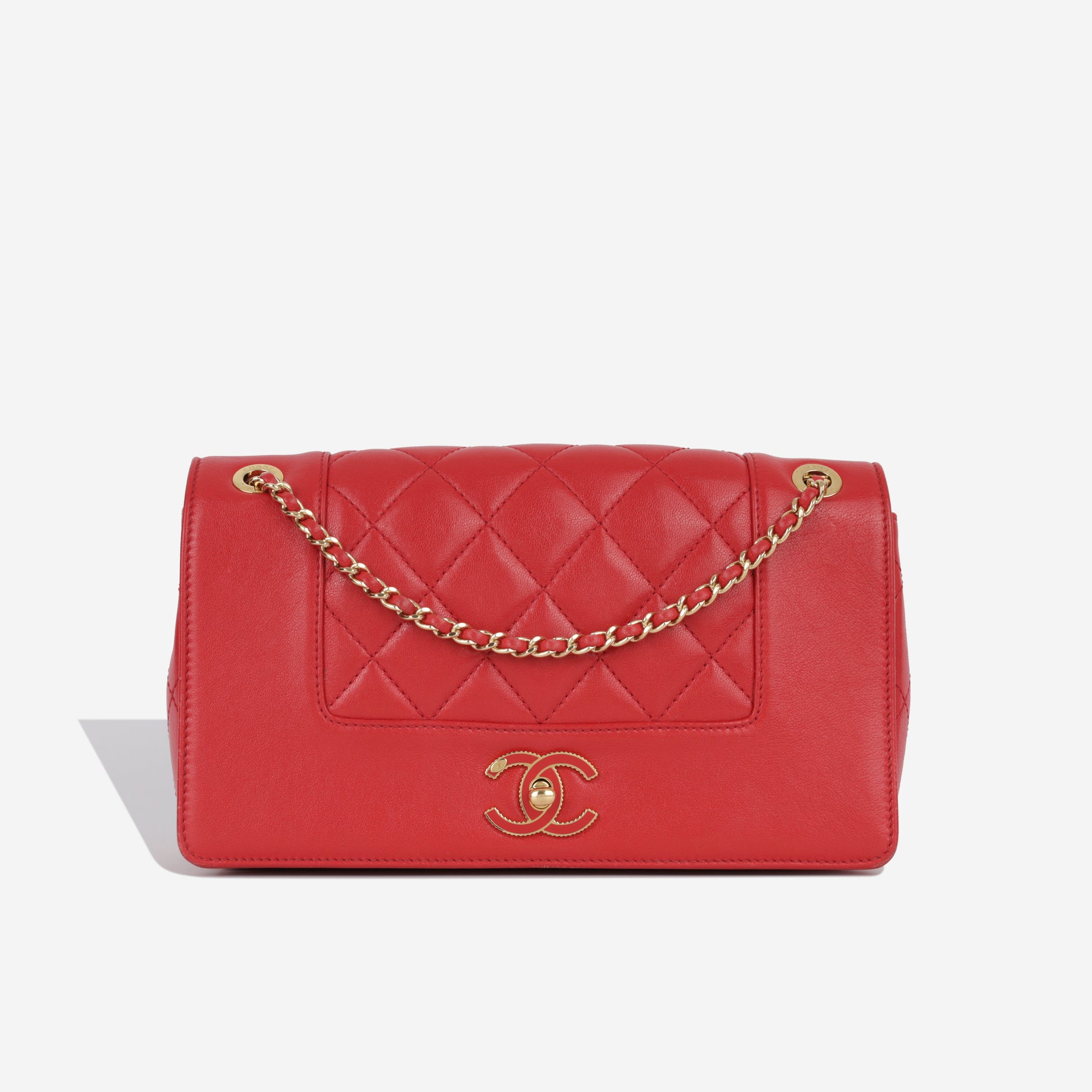 This flap bag from French fashion house Chanel is a rare find, featuring the signature central quilted lambskin, contrasted against a smooth leather panel round the edges. The beautiful shade of red can be worn throughout the year, and the gold tone hardware is the iconic choice to make to stand out from the crowd.