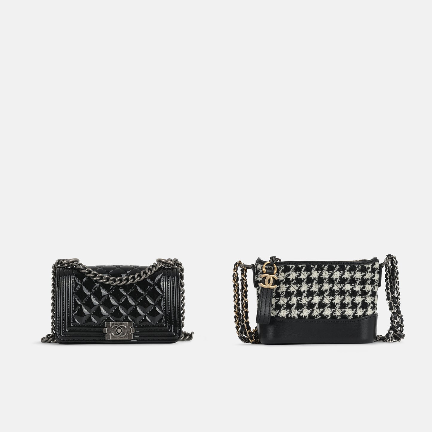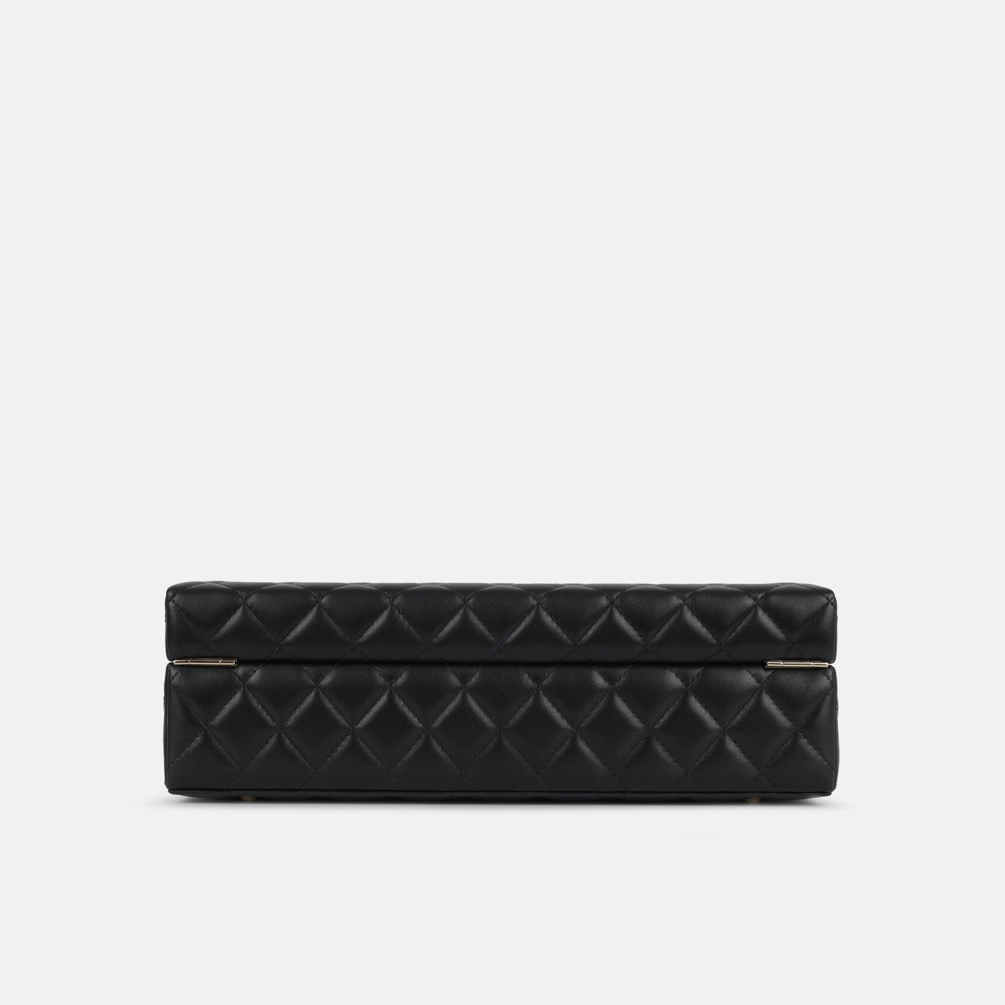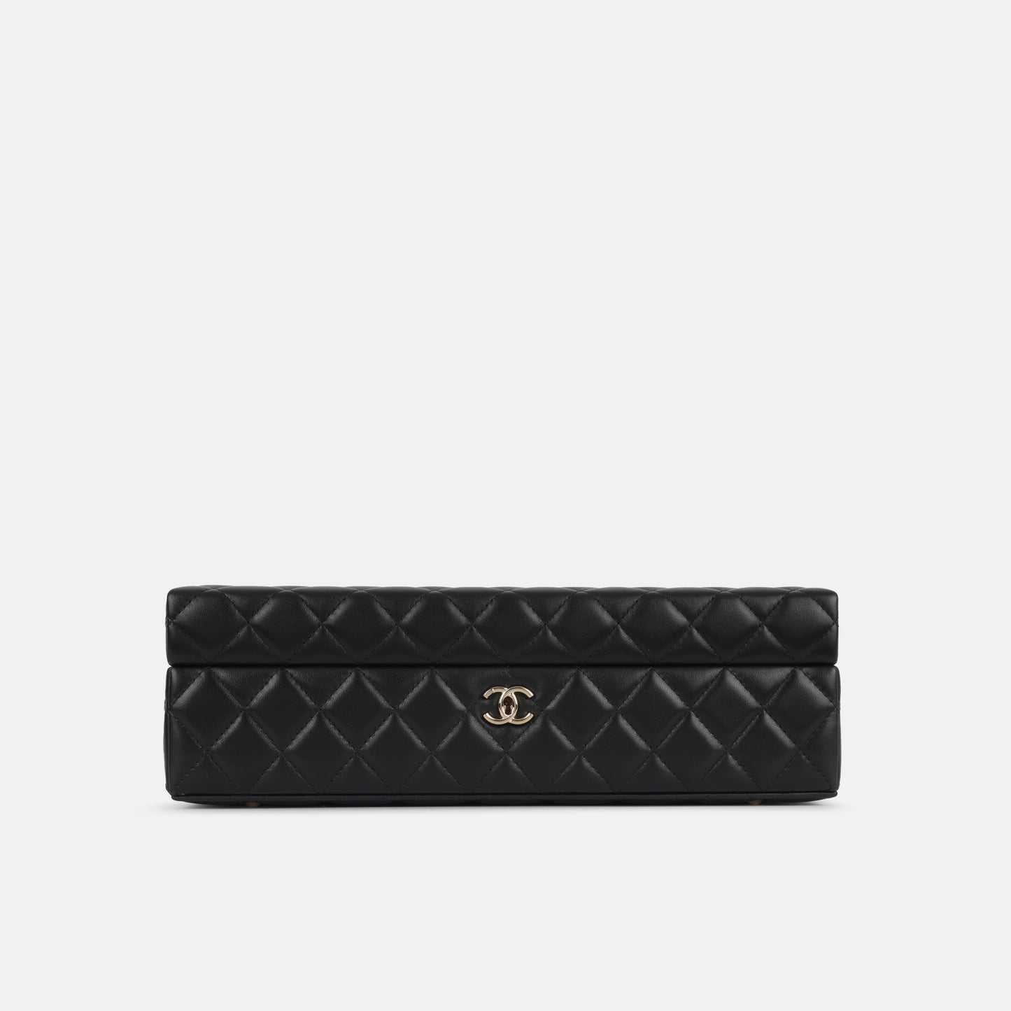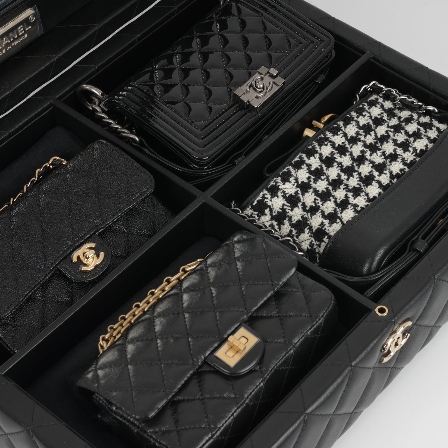 This highly collectible Success Story trunk showcases four miniature versions of Chanel’s most iconic bags (Classic Flap, 2.55 Reissue, Gabrielle Bag, Boy Bag) , all housed in a luxurious black lambskin leather trunk with pale gold-tone hardware. The trunk features a signature CC lock closure, an interior mirror, four compartments to store the mini bags, studded feet, and two keys for added security.