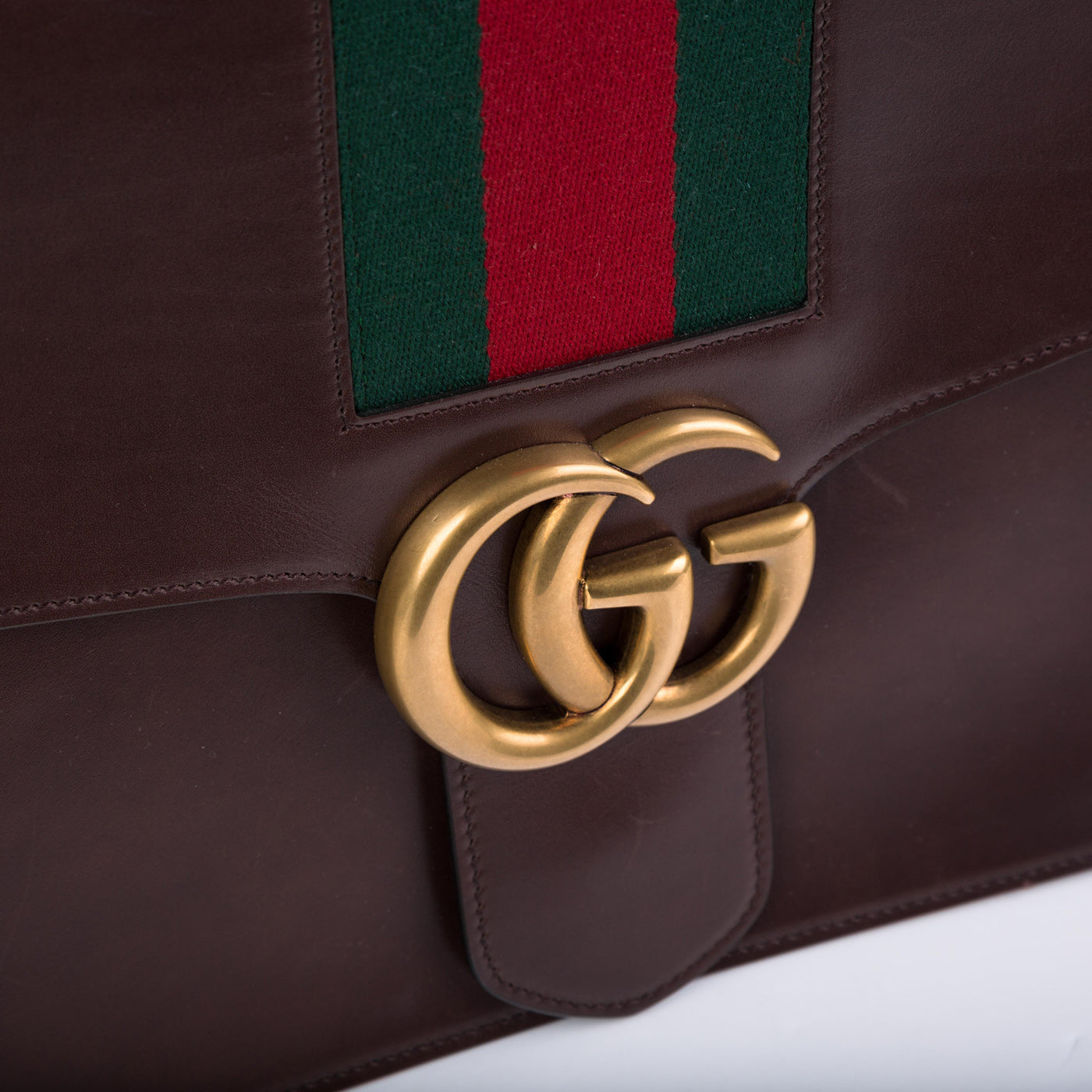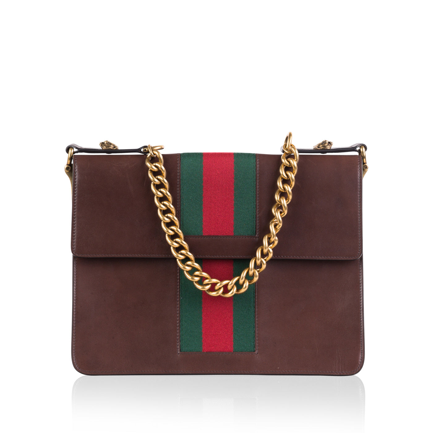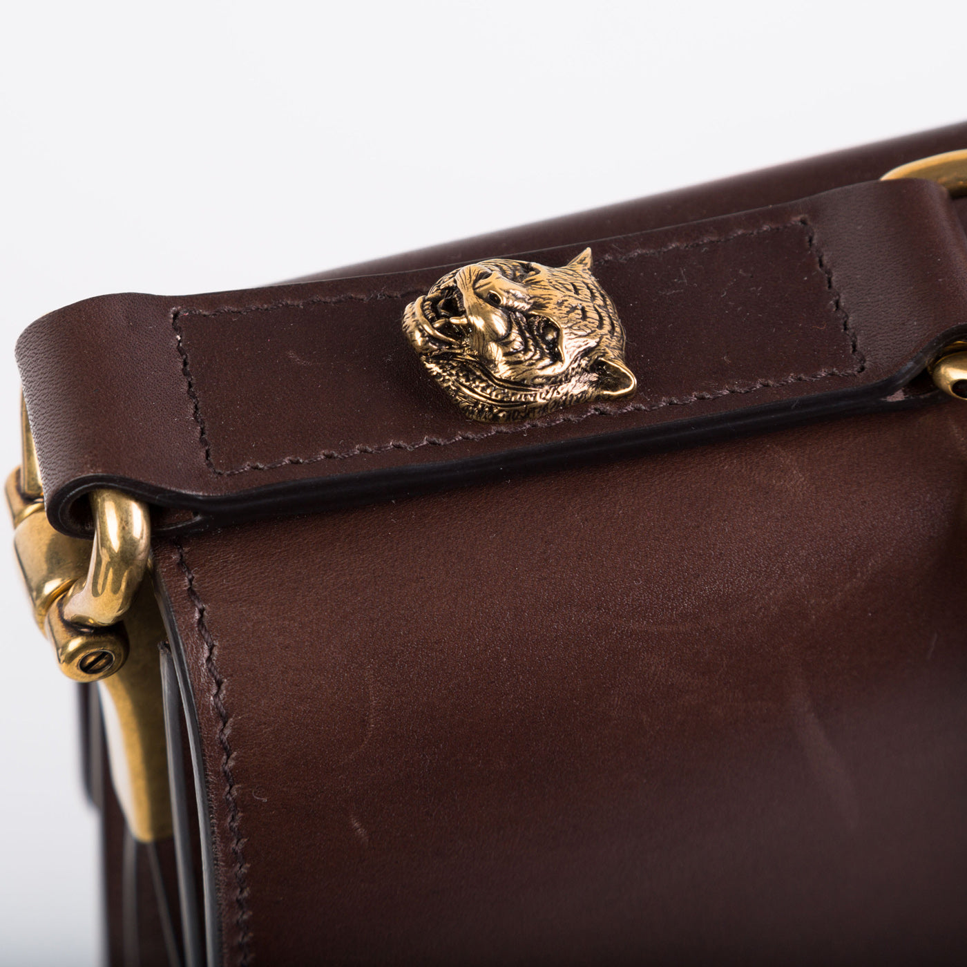 This rare Gucci shoulder bag is a unique piece to add to your collection. The brown leather creates a satchel feel to it, bringing back 1940's class to your wardrobe. This bag is decorated with the classic Gucci colours and it is beautifully embellished with the iconic tiger heads. The Marmont Shoulder bag has 3 compartments, all which have their specific purpose. The two pockets at the front and the back are perfectly thin for storing documents, a sleek wallet, phones - both fasten with a magnetic closure system. The main compartment in the middle sits deep within the bag, and as you add more items, the base of the bag has the ability to expand out. Style with a beige coat and a pair of kitten heels for a timeless feel.