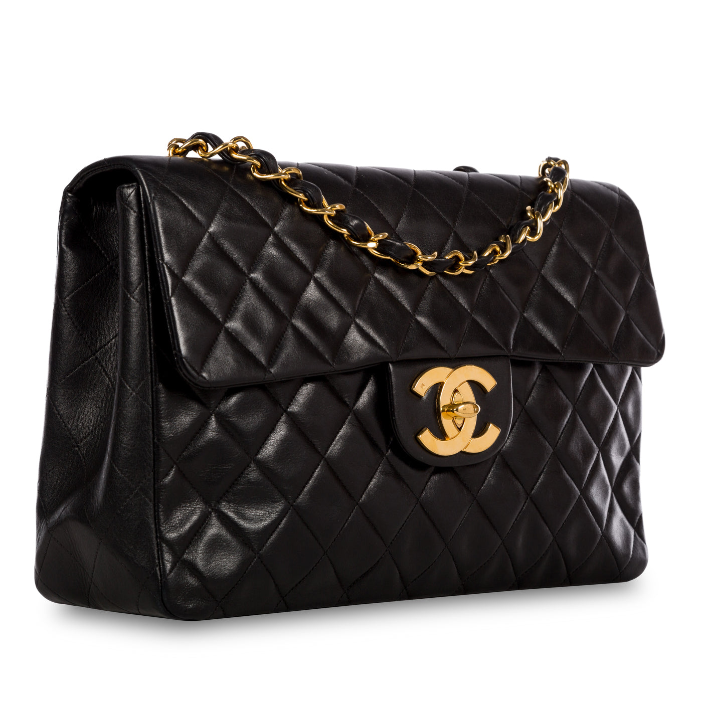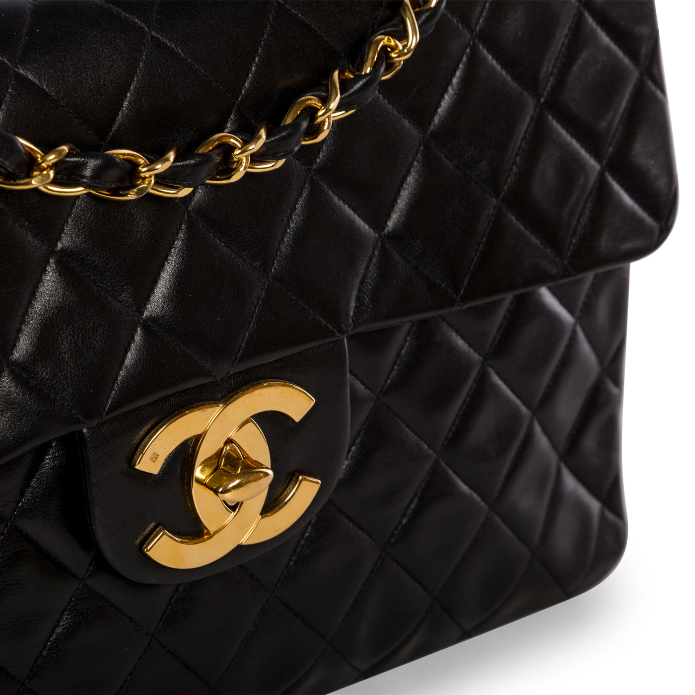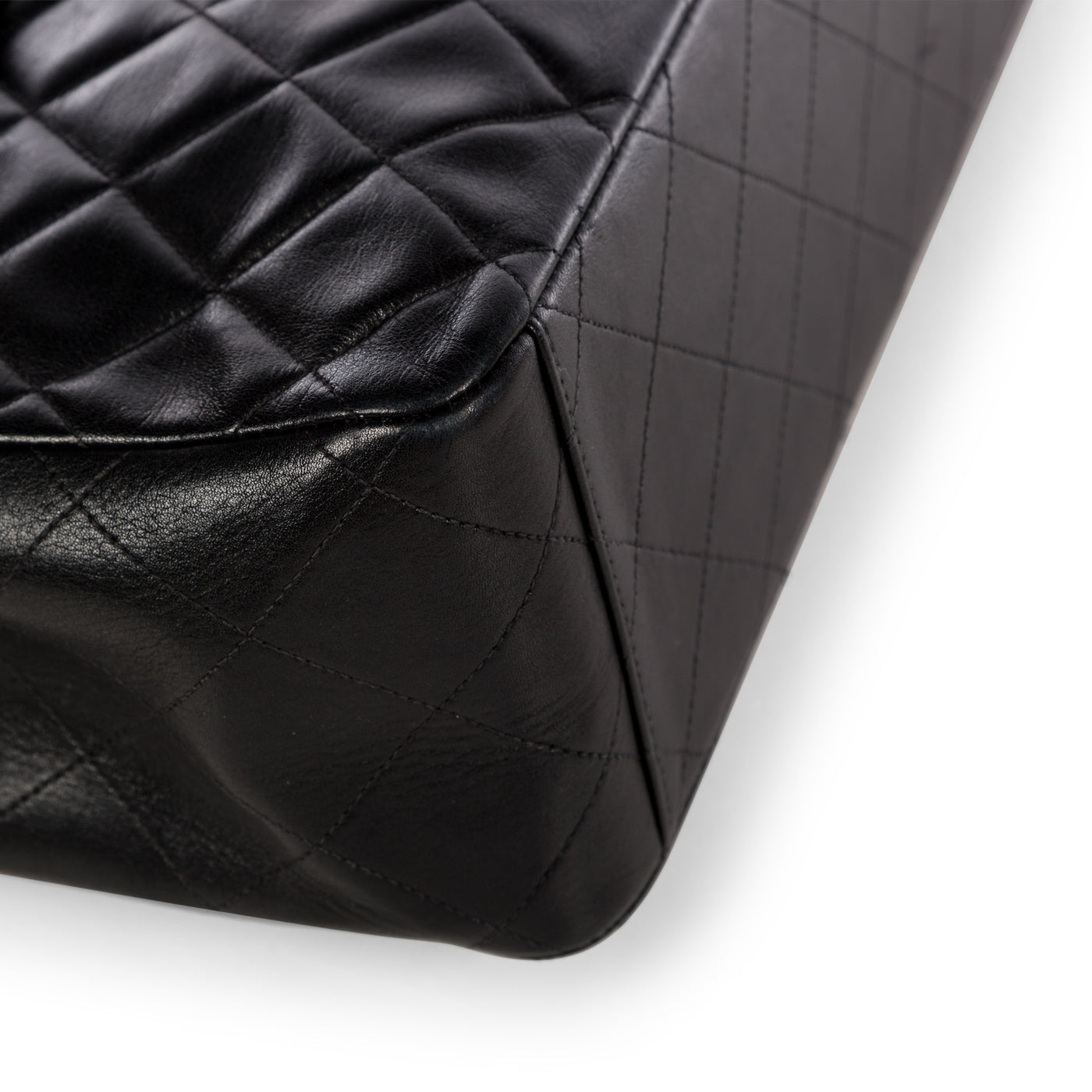 For all the vintage Chanel lovers, this one's for you. This rare Maxi Jumbo XL Classic Flap is definitely not easy to find. With its smooth, quilted lambskin leather, gold tone hardware and XL CC logo clasp, this bag is elegant and sophisticated. Ideal for day-to-night usage, you can fit your whole world comfortably inside. Timeless, classic and the ultimate addition to any luxury handbag collection, this vintage gem is a true must-have.