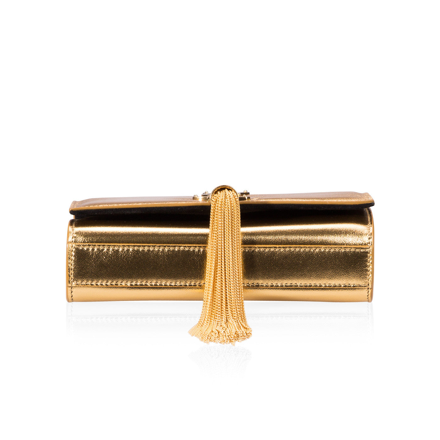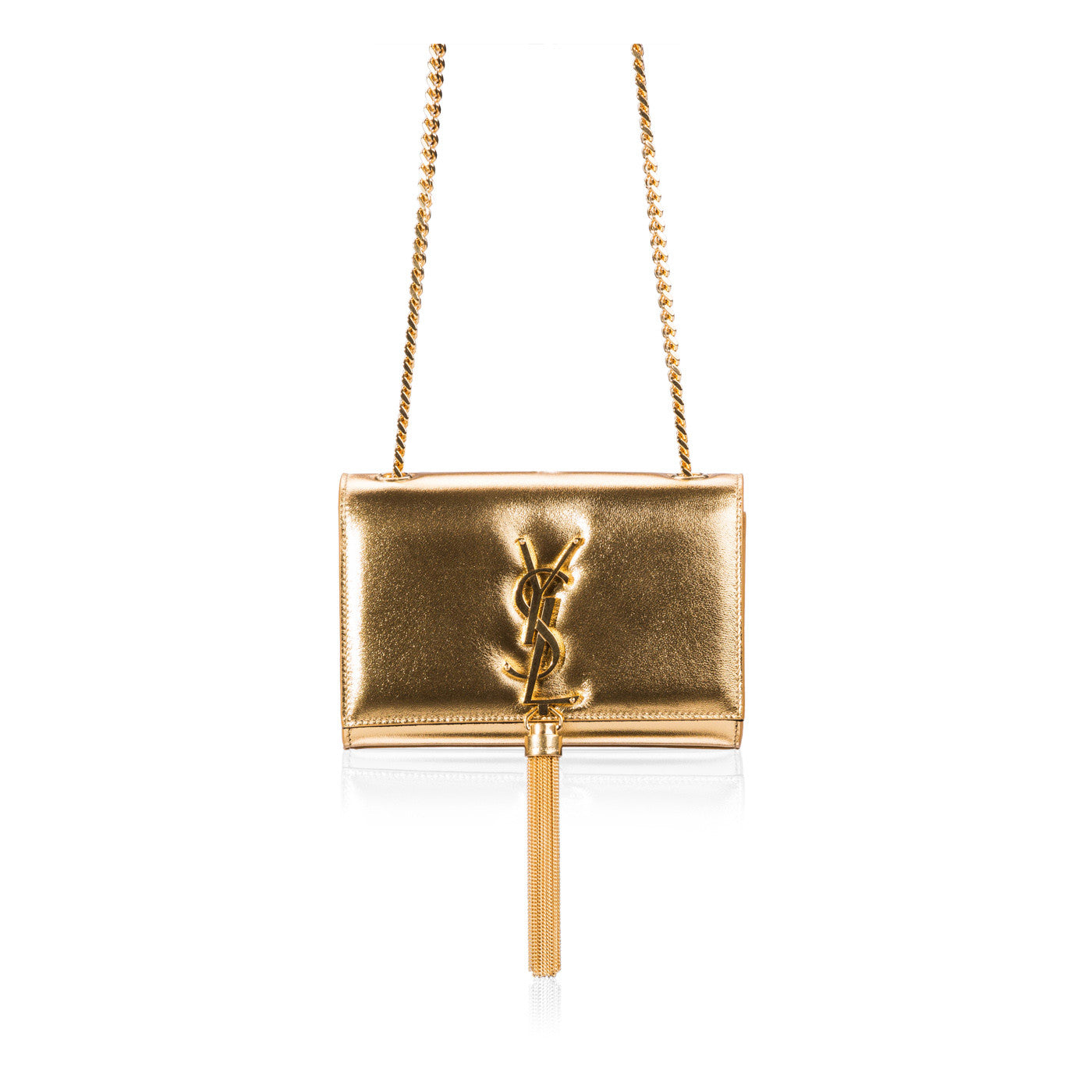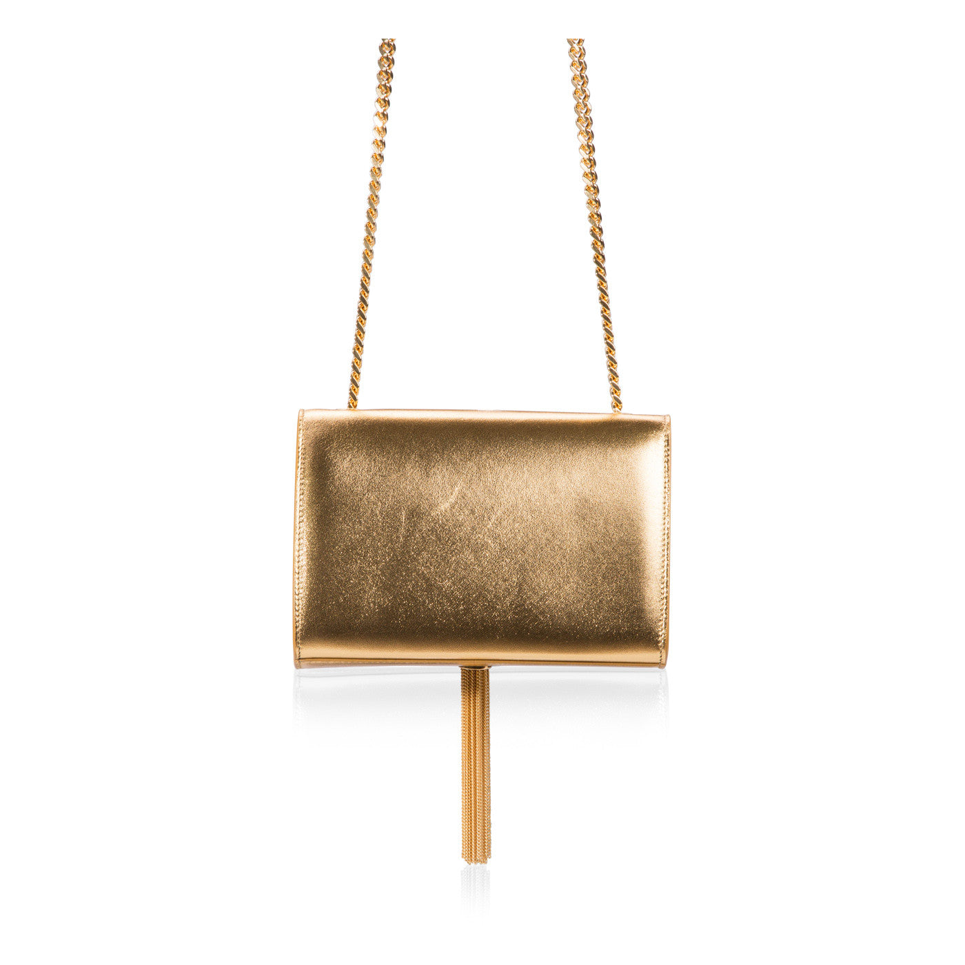 This stunning gold Kate bag by Saint Laurent is show stopping and glamorous. Crafted out of a textured, supple leather and finished with a playful metal tassel, this is a chic and on-trend bag that is perfect for a formal evening event. The long metal chain is detachable which allows it to be worn as a clutch or over the shoulder. For a modern choice of bag in a classic style and shape, this is the ideal investment for any special occasion.