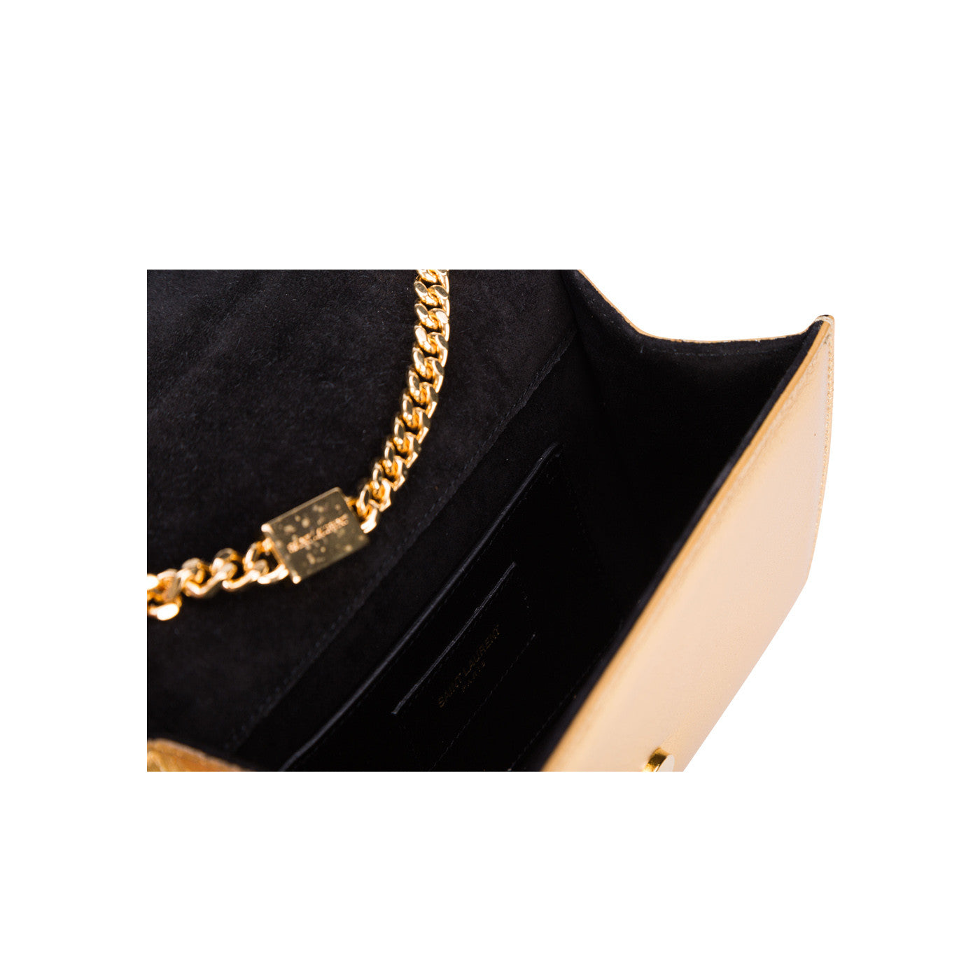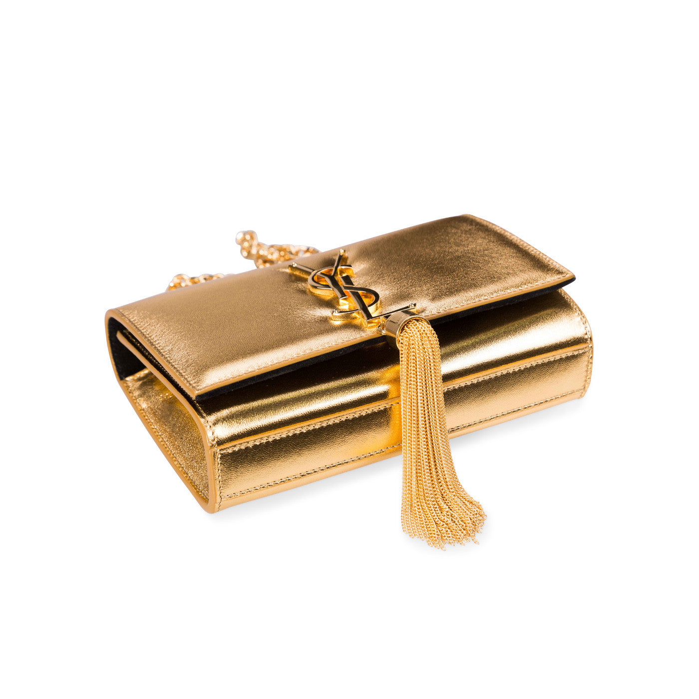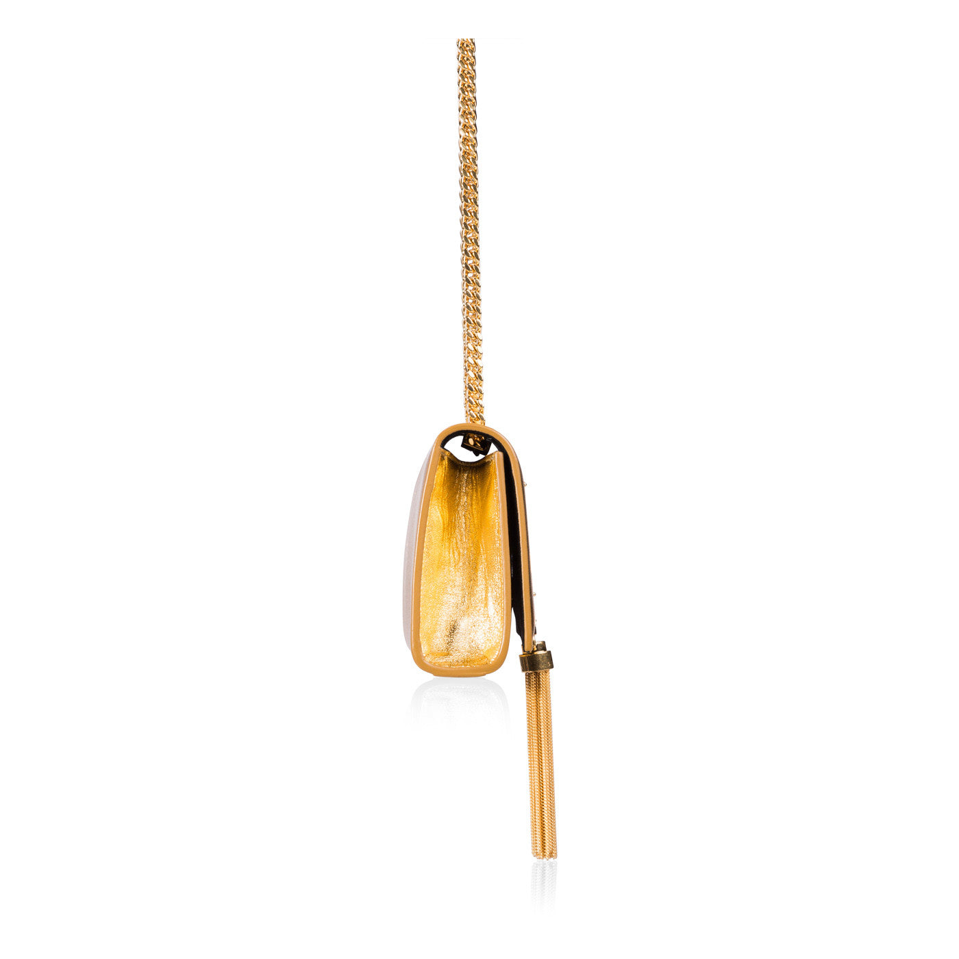 This stunning gold Kate bag by Saint Laurent is show stopping and glamorous. Crafted out of a textured, supple leather and finished with a playful metal tassel, this is a chic and on-trend bag that is perfect for a formal evening event. The long metal chain is detachable which allows it to be worn as a clutch or over the shoulder. For a modern choice of bag in a classic style and shape, this is the ideal investment for any special occasion.